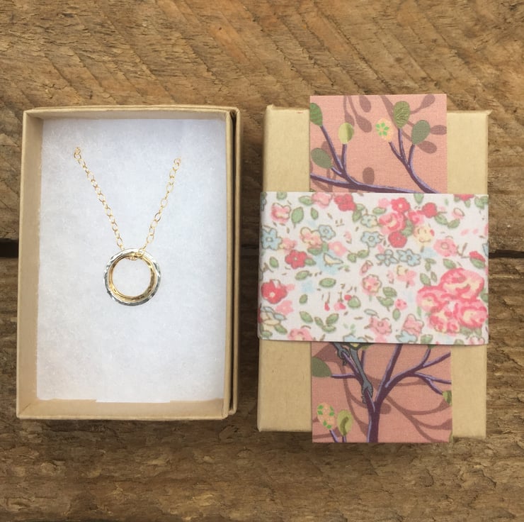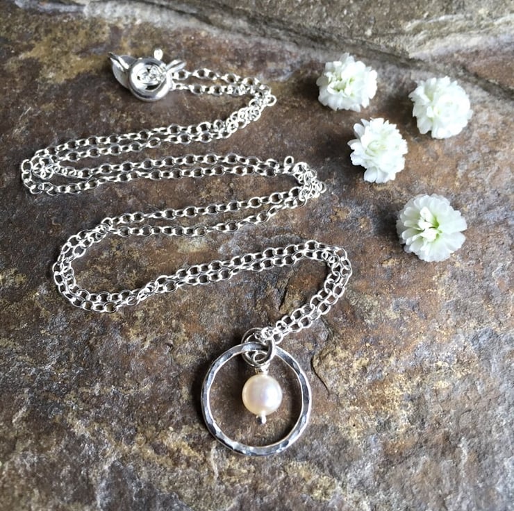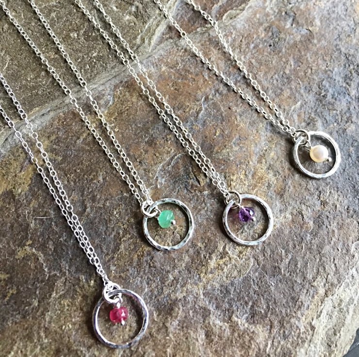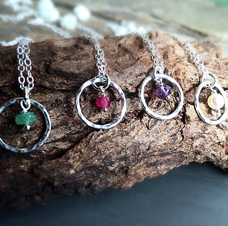 Pretty sterling silver birthstone necklace with a sterling silver hoop which I have hammered by hand.