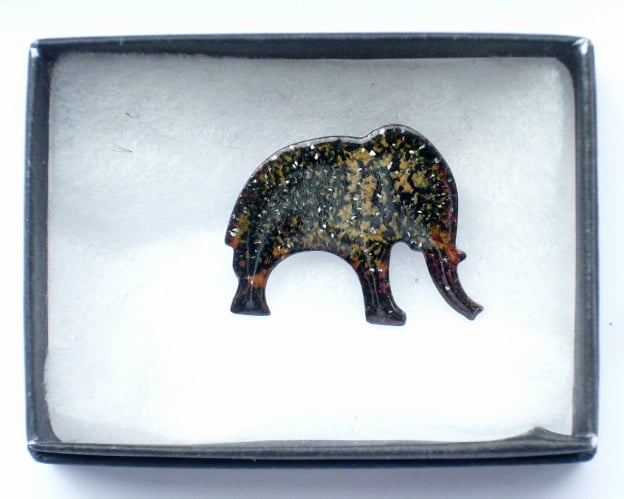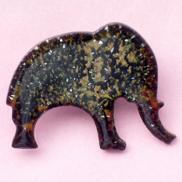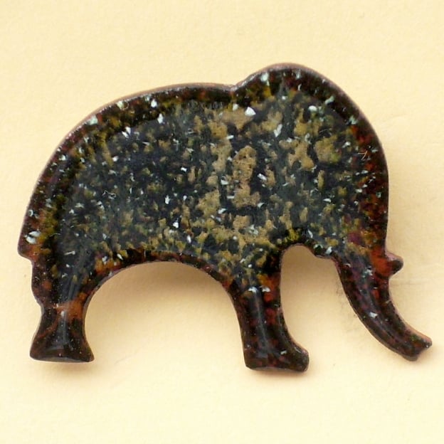 I have made this brooch by laying black enamel powder over a coat of clear enamel. As you may see, this creates a mottled effect in which the copper shape below shows through in shades of golden brown.