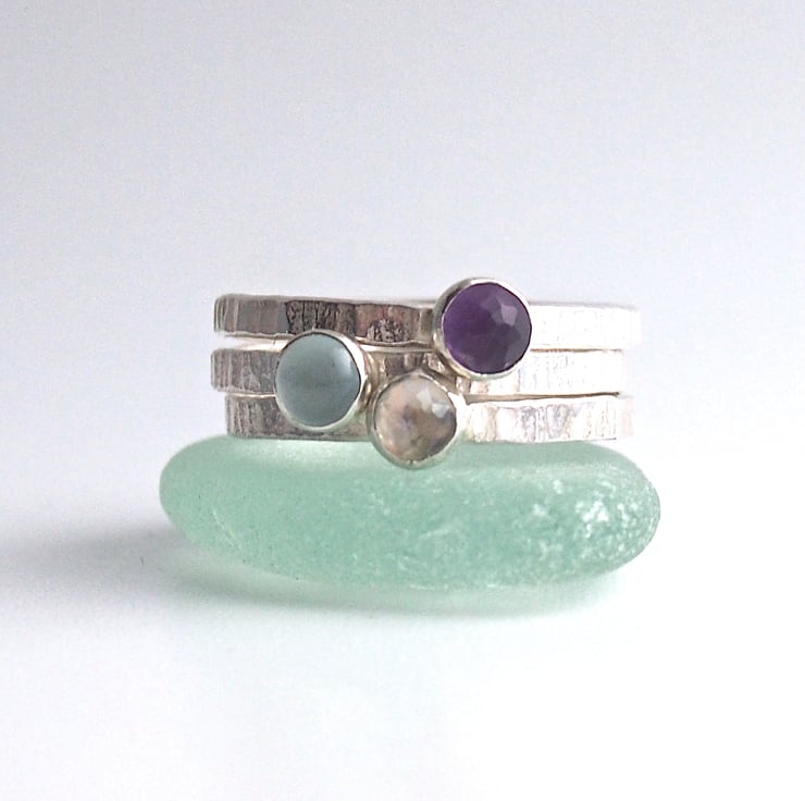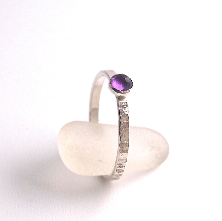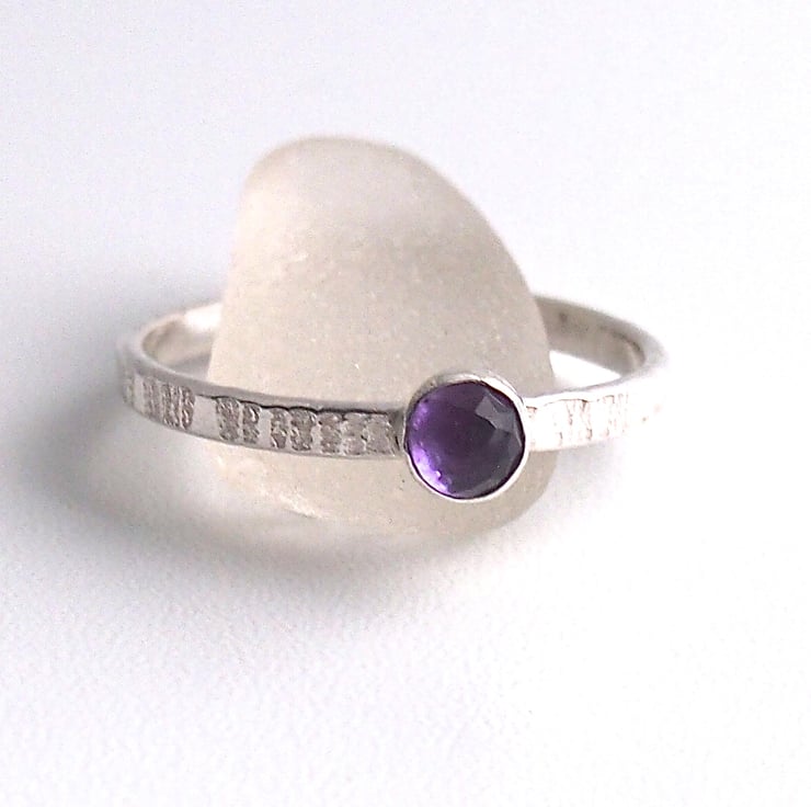 A slim 2mm textured sterling silver band with a 4mm rose cut deep purple African amethyst.