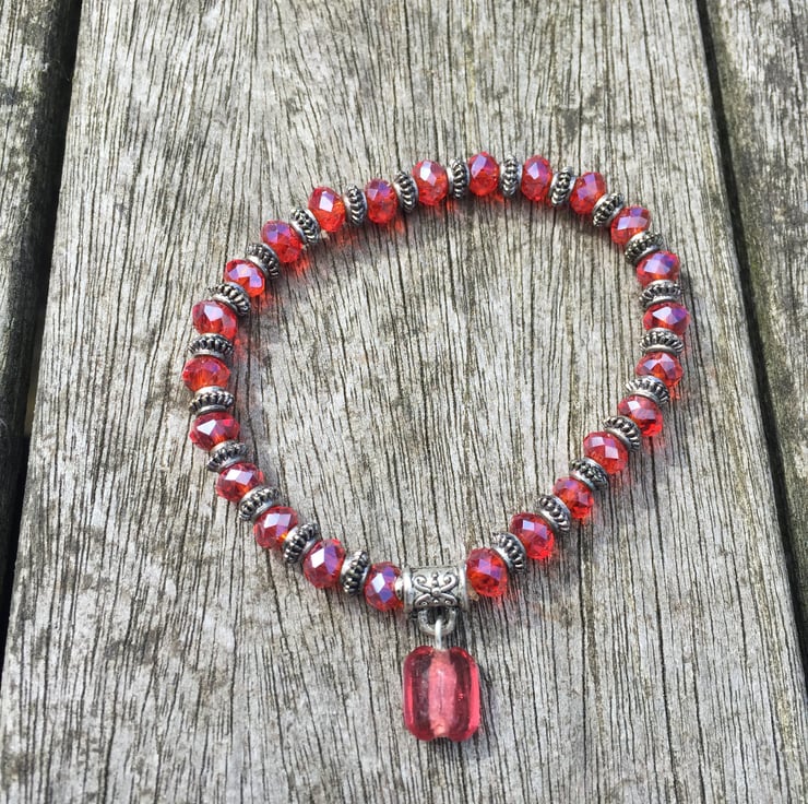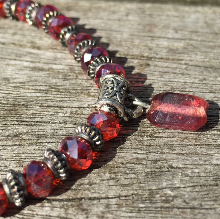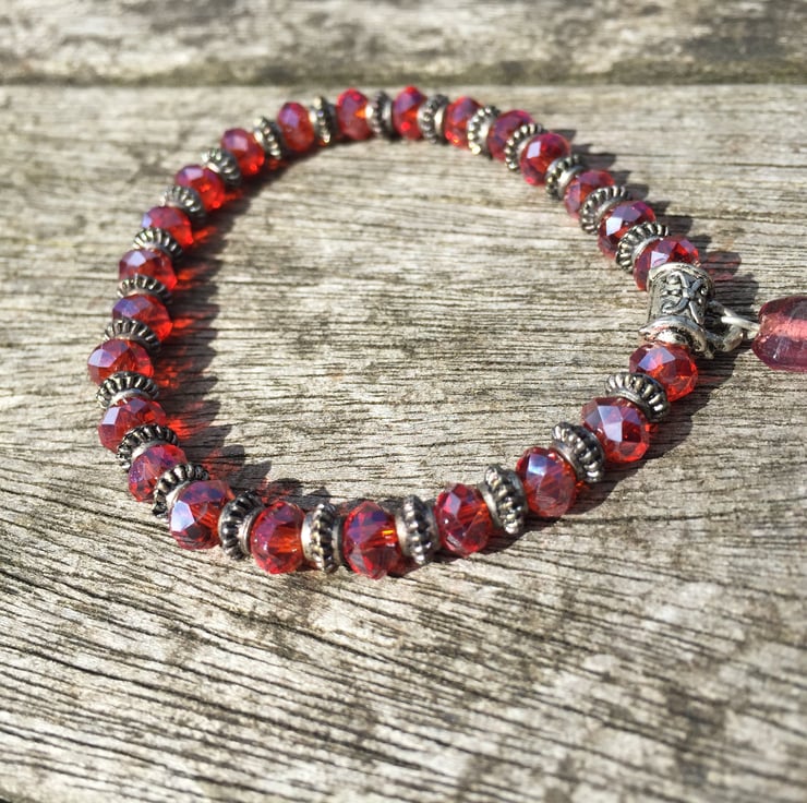 Swarovski cut red glass beads with antique silver spacers and charm.