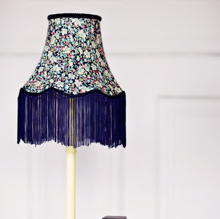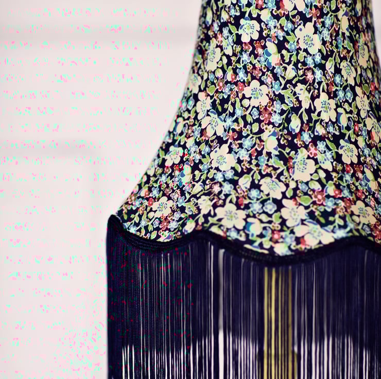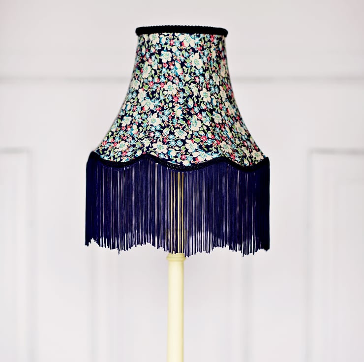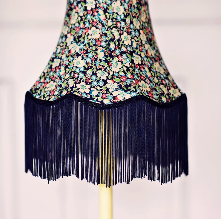 This is a vintage shaped lampshade that has a contemporary feel with a beautiful fabric and a long fringe braid to finish it off. I have made this shade with a beautiful Liberty cotton lawn fabric and it has been completely hand stitched. The lampshade has a bottom diameter of 26cm and it looks wonderful on a tall table lamp base. This shade is unlined.
