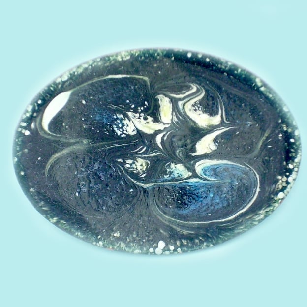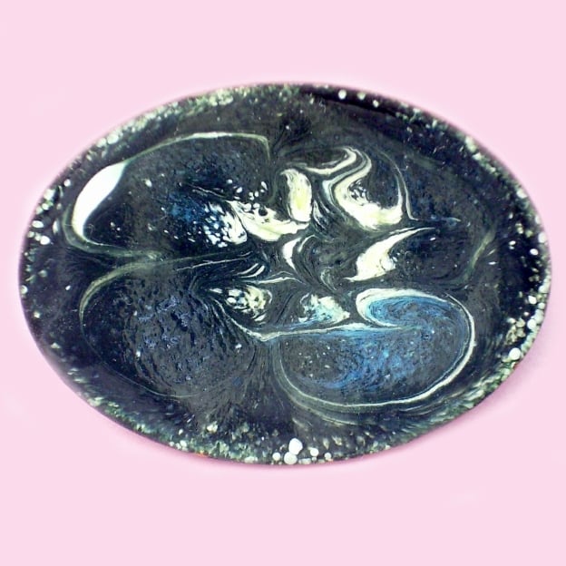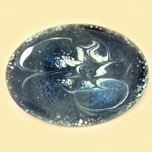 This brooch is 40mm by 30mm, with a scrolled decoration. The black coat is laid over white enamel. The scrolling shows cream and two shades of blue, one mid-blue and one dark blue.