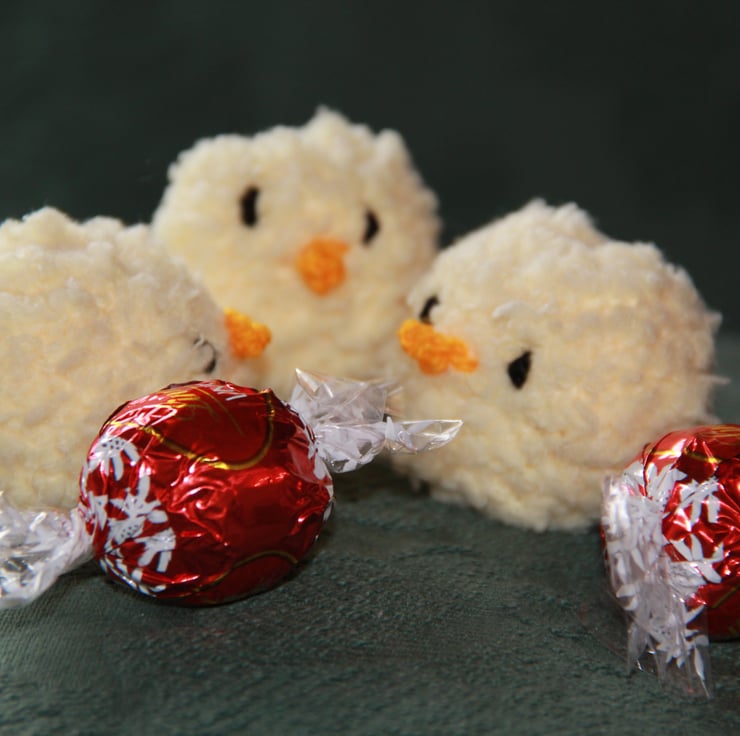 A bundle of fluffy yellow chicks with bright orange beaks, just big enough to hold a little sweet treat such as a few small eggs, a Ferrero Rocher or Lindor chocolate. Lovely to give as an inexpensive Easter treat without too much chocolate! I can knit these in white or pink too if you want to jazz things up a bit!
