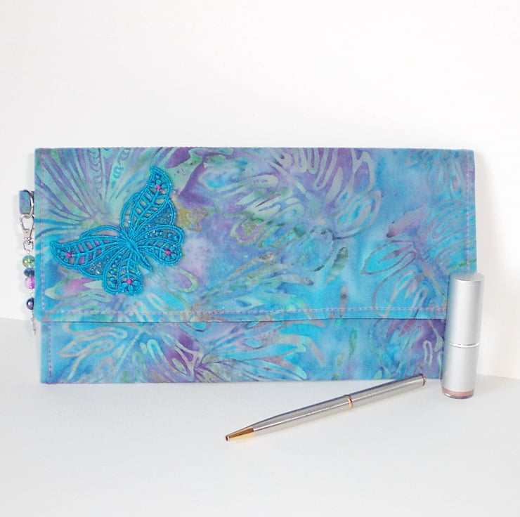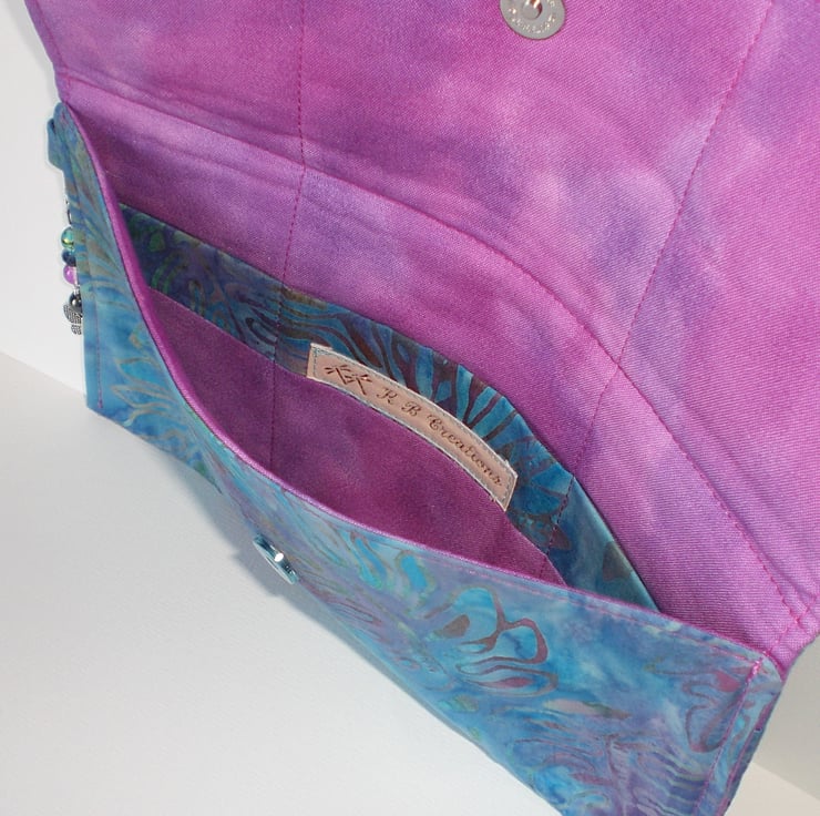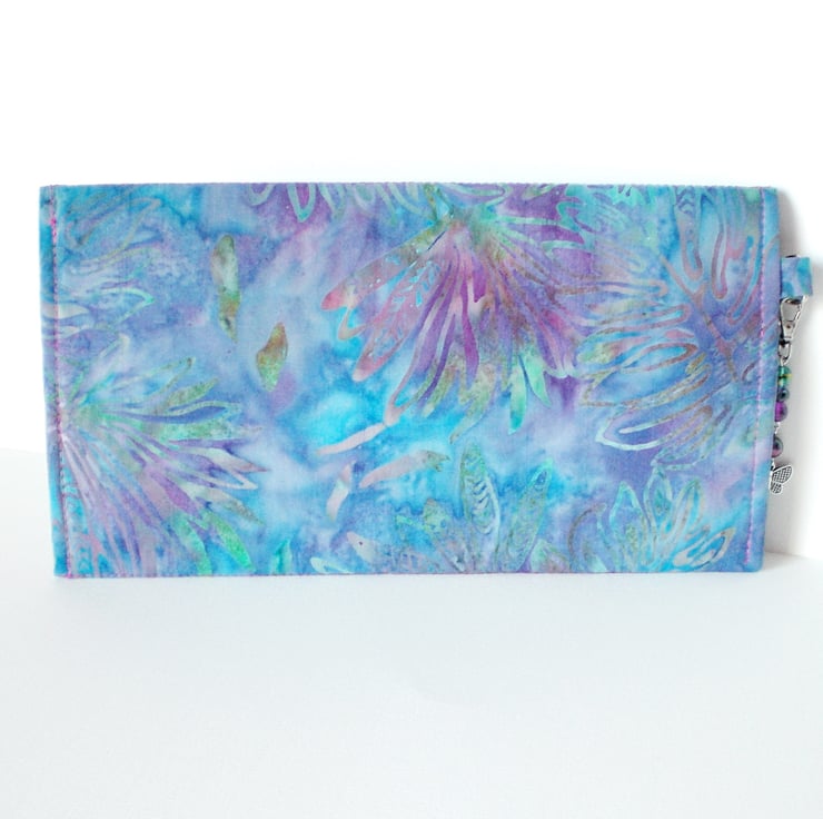 This is a lovely clutch bag made in a Batik multi colour print fabric of mainly blues. greens, pinks and purples