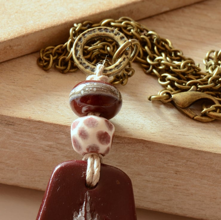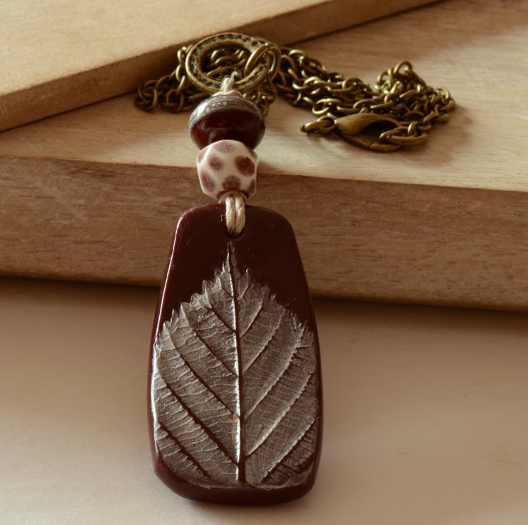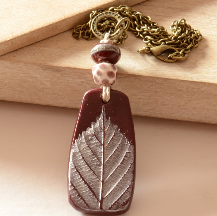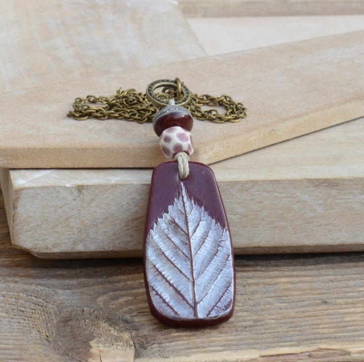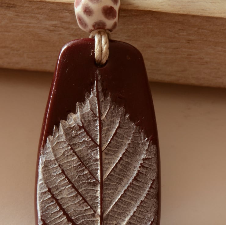 The clay pendant is a deep burgundy colour and features a hand painted pressed leaf design, handmade by Ashley Bonney.