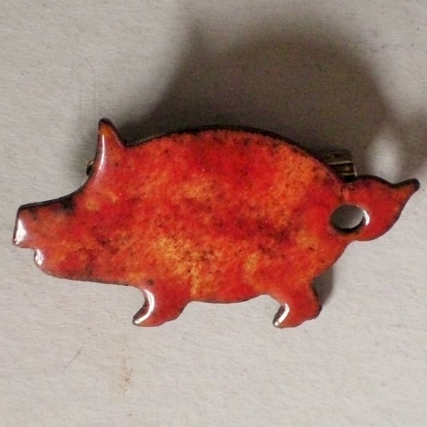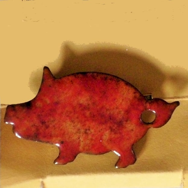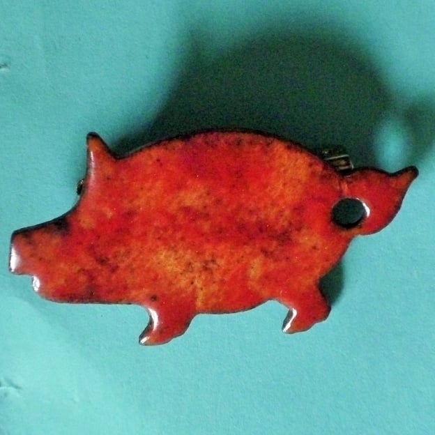 I have made this brooch in red enamel over a clear enamel. This offers some variation of tone and depth of the red with the copper base showing through in golden brown tones. I have drawn in some features, eye and haunches, before the red coat was fired and these are subtly hinted in the final piece.