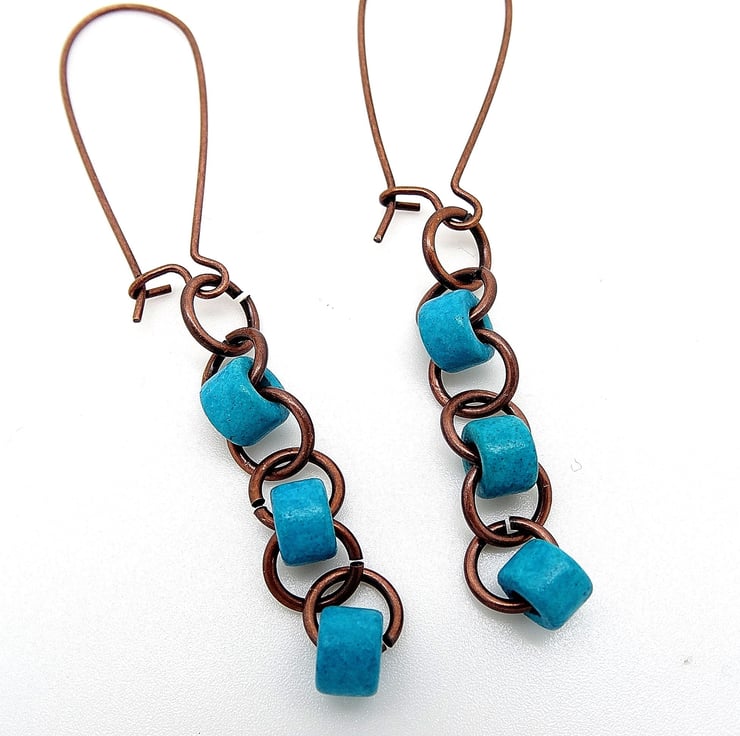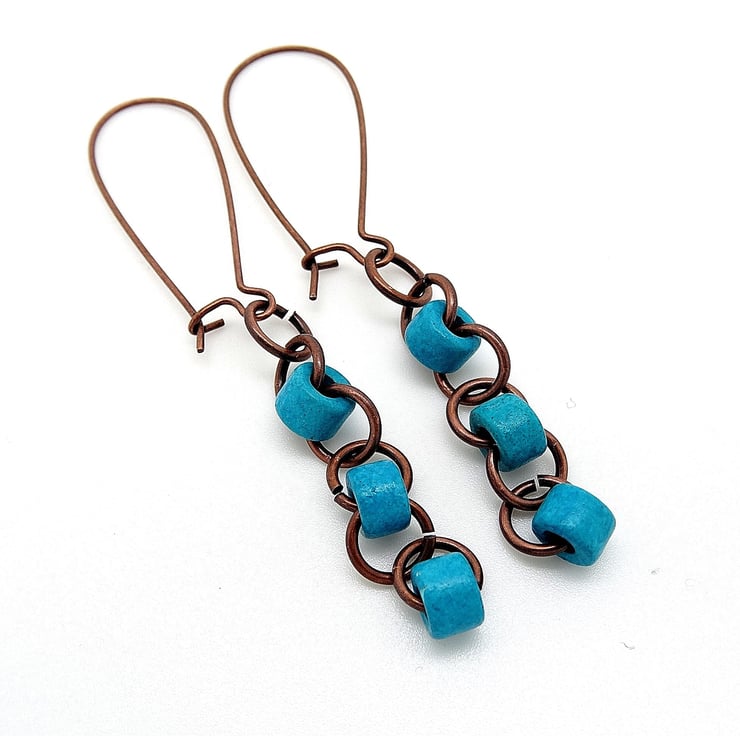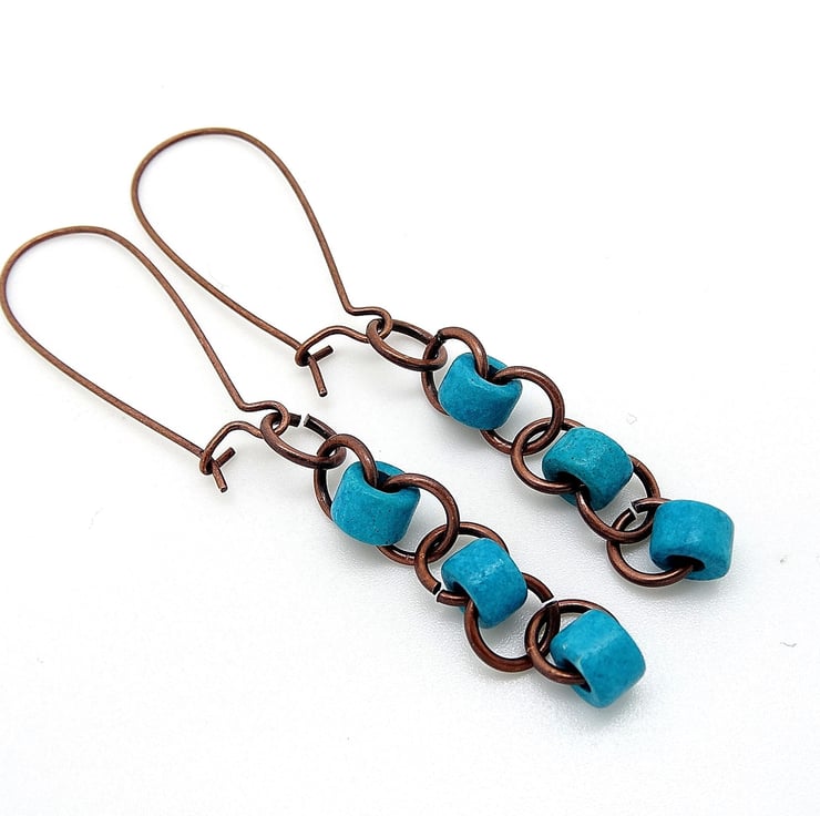 These earrings are lovely made with turquoise colour ceramic tubes and linked together with antiqued copper rings. The earrings hang from antiqued copper lever back earwires, they measure 6.1/2cm (2.1/2") from top of earwires. As all of the items in my shop are unique individual pieces, these are the earrings you will receive. They will arrive gift wrapped in tissue paper and a organza bag.