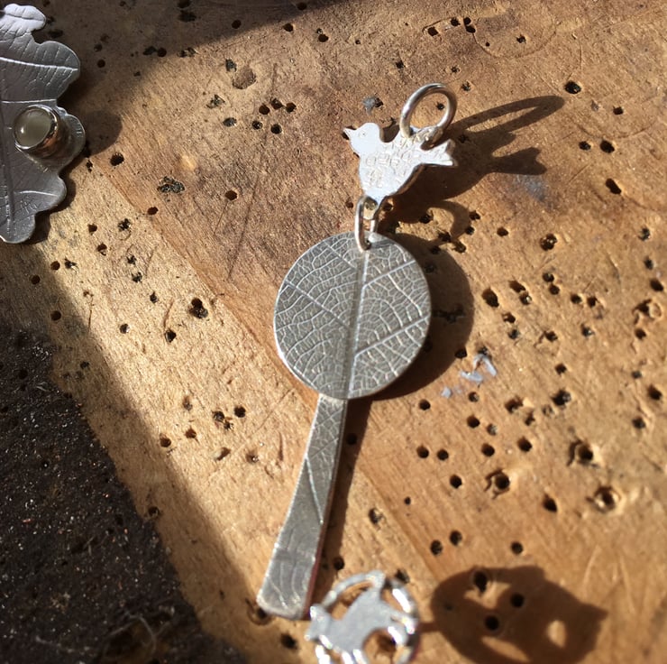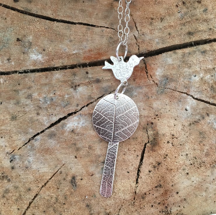 Articulation gives movement as you wear this handmade silver pendant. Happy lolly pop tree with a cutle little bird . This pendant will appeal to all ages.
