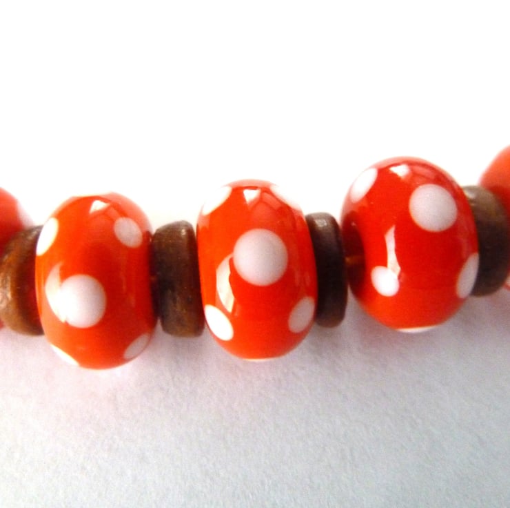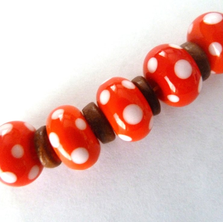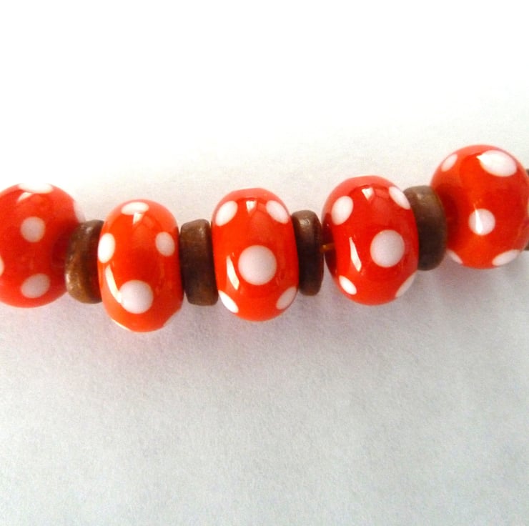 A set of 5 handmade lampwork glass beads which have been made with orange glass and feature white spots.