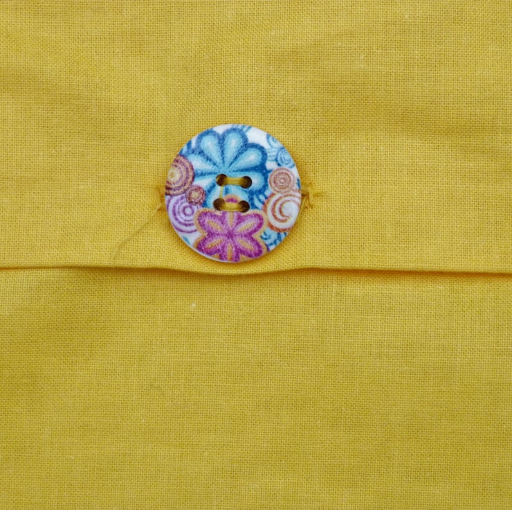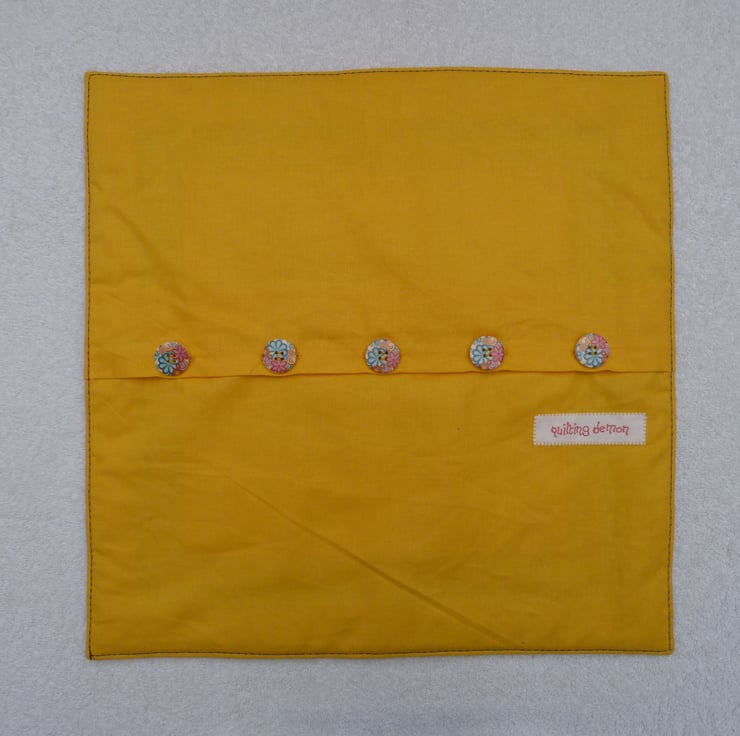 The beetle has been pieced and machine zig zag stitched in place. I have then quilted the cushion front. The cushion is completed with a button back fastening.