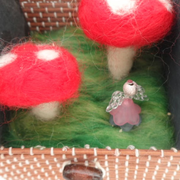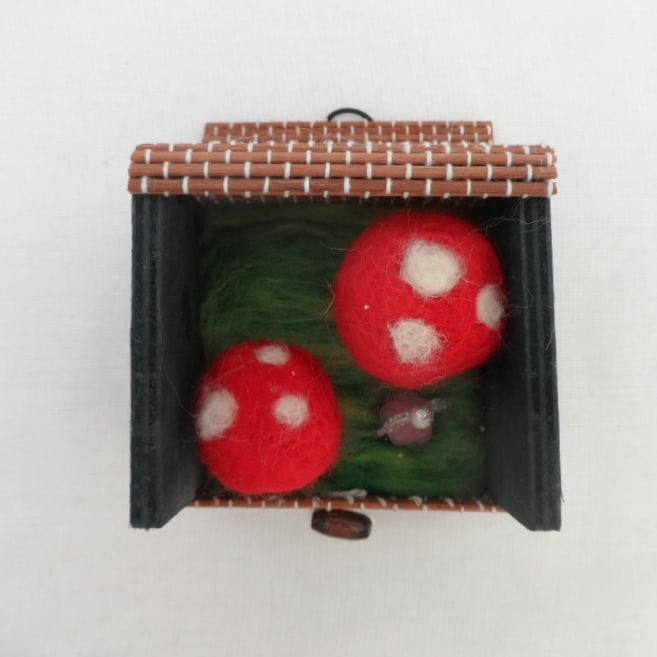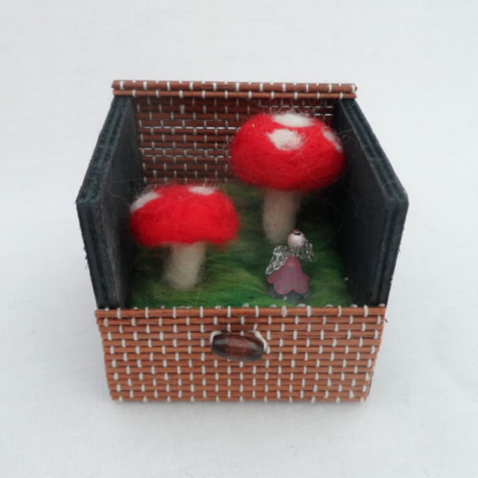 The needle felting depicts a miniature 3D scene of a beaded fairy amongst the magic toadstools. The whole box measures just 8cm x 8cm x 9cm. The lid is integral to the box and can be folded down and secured shut with a toggle type button. A sweet little gift.