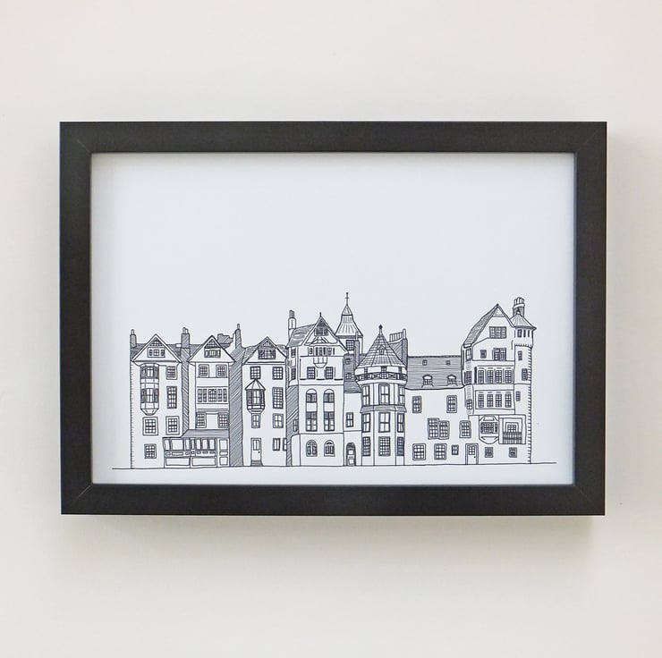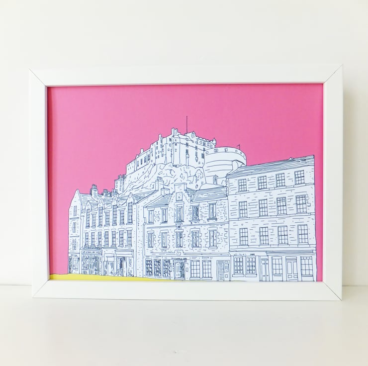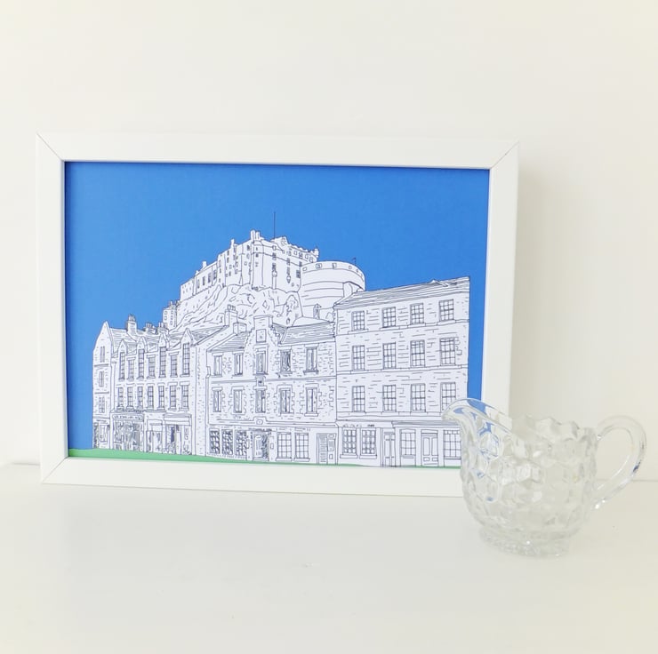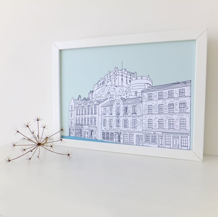 This fabulous Edinburgh print of Edinburgh Castle and the Grassmarket. A wonderful piece of Scottish art for your home. This Edinburgh illustration makes the perfect gift for anyone who loves Edinburgh or architecture!