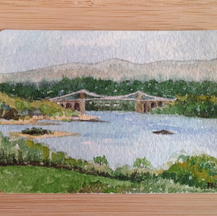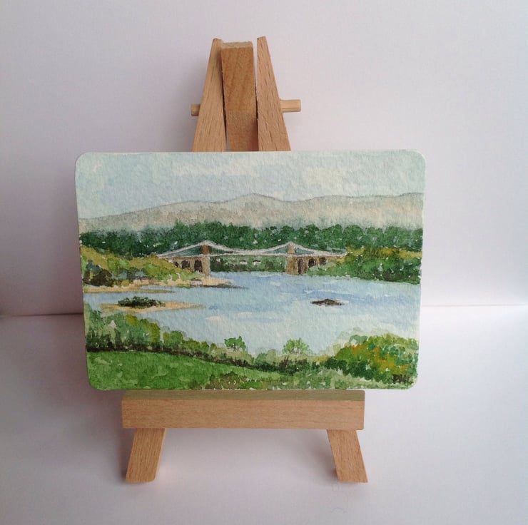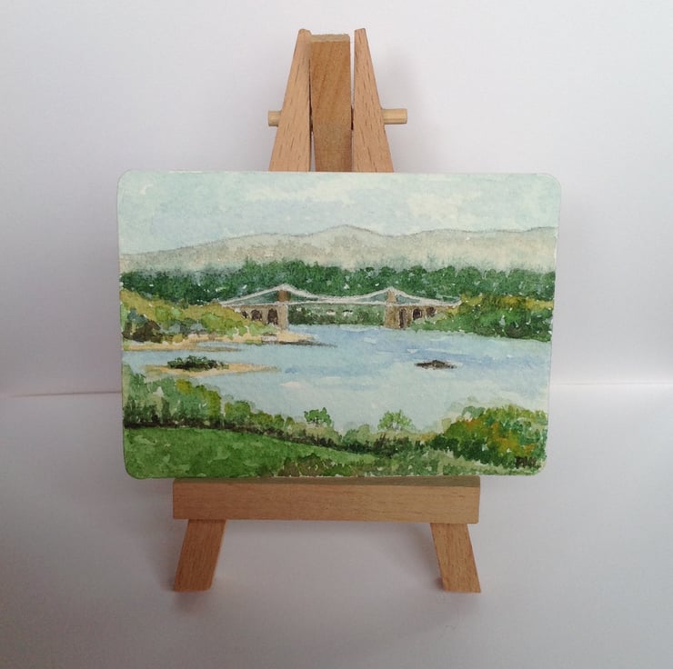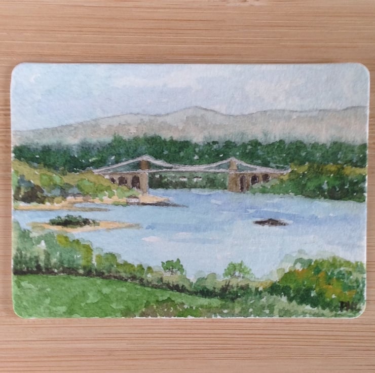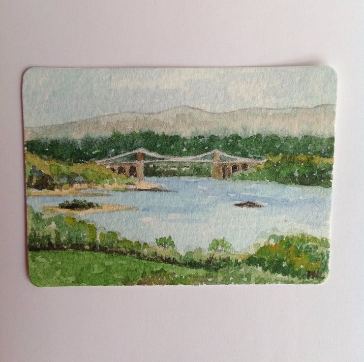 This ACEO is an original, handpainted watercolour of a view of the Menai Bridge from Anglesey, North Wales.