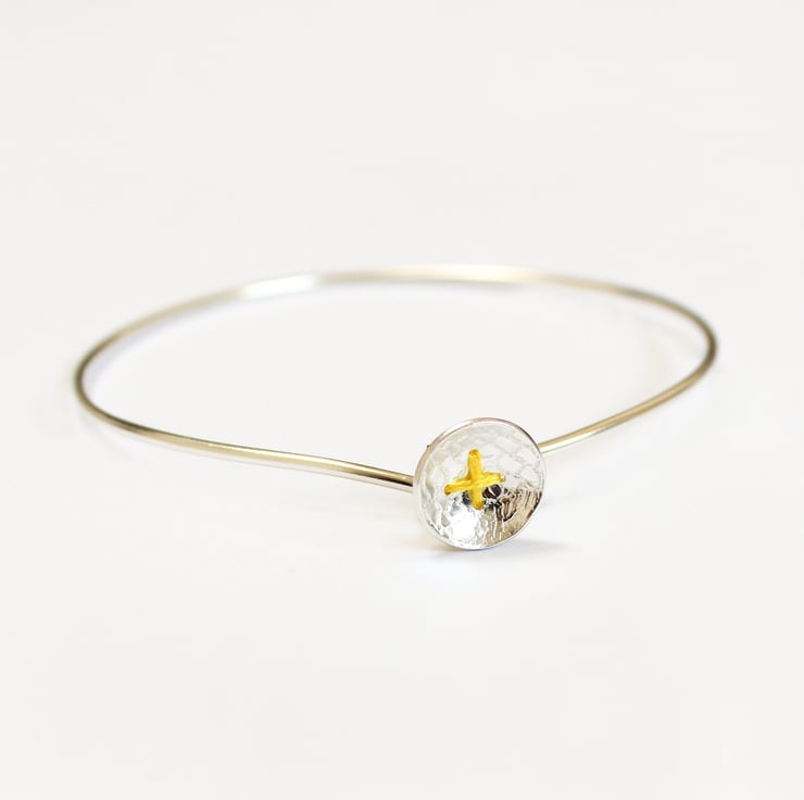 Textured with vintage lace, I have created the appearance of a button by slightly doming and drilling 4 holes into the silver. The bangle design uses a hook clasp fastening which is concealed behind the button. I love this design.