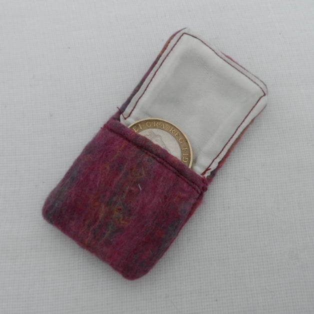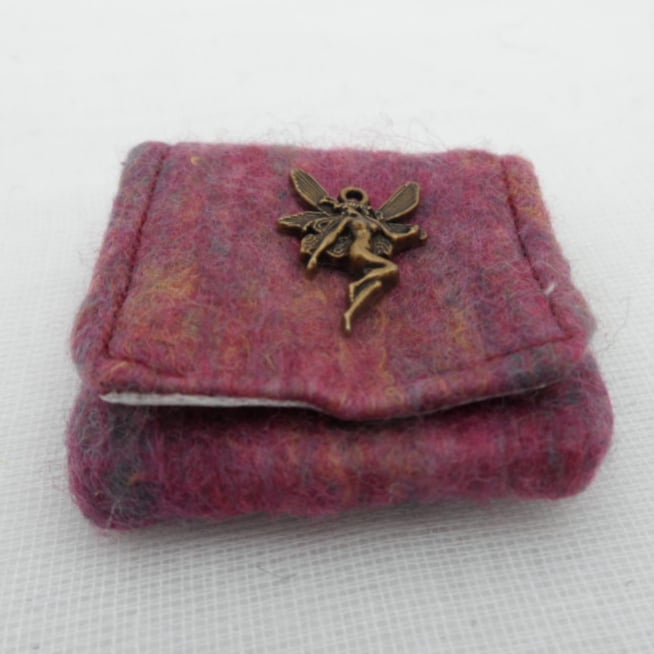 A sweet little pouch to hold your childs tooth until the tooth fairy comes and swaps it for a coin. No more fumbling around under the pillow to find a tiny single tooth! Measuring 4.5cm square this pouch has been made form hand felted merino wool in dark pink shades. It has been lined with a cream satin fabric to give a luxurious touch and is finished with an antique brass fairy charm on the front. It is large enough to hold any coin up to a £2 coin (or even a folded note!) depending on how generous your tooth fairy happens to be.