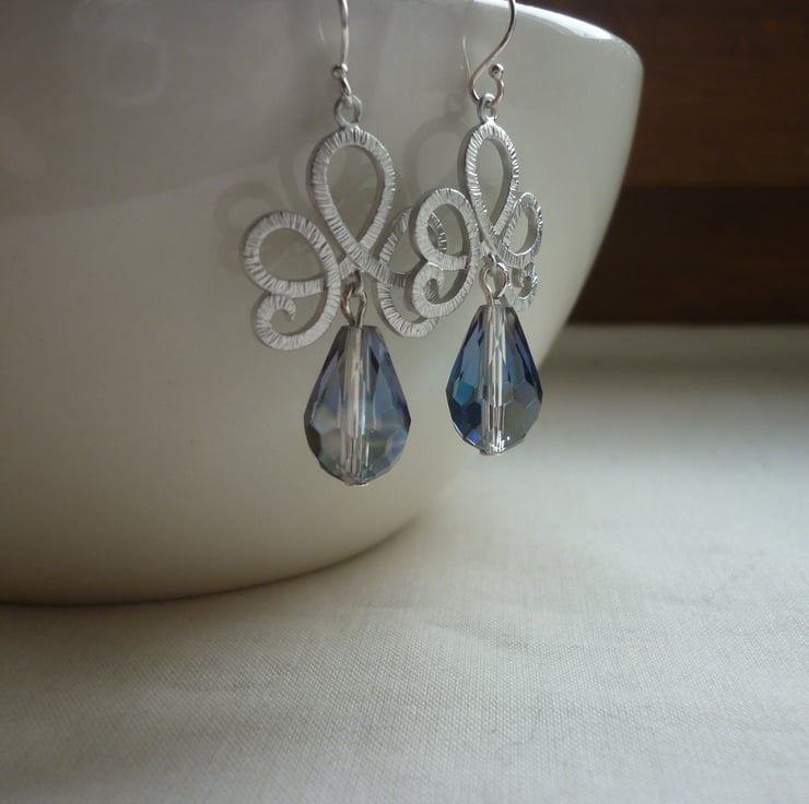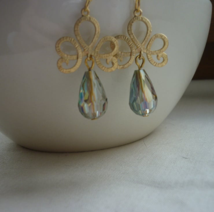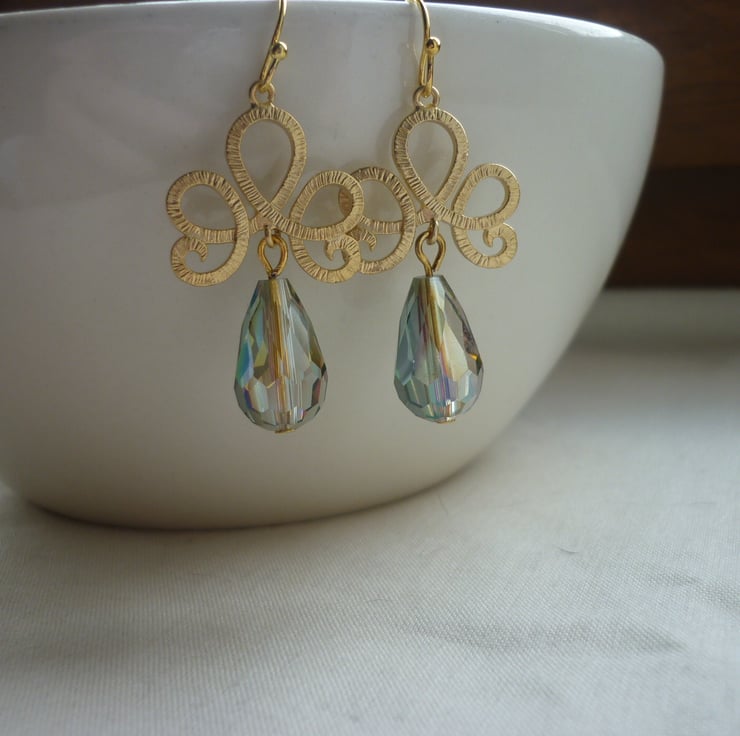 THE EARRINGS HAVE BEEN MADE USING GOLD PLATED FANCY EARRING CONNECTORS ALONG WITH TEAR DROP FACETED CRYSTALS IN CRYSTAL WITH GREEN PLATE TO THEM. THE EARRINGS HAVE BEEN FINISHED WITH GOLD PLATED EAR WIRES.