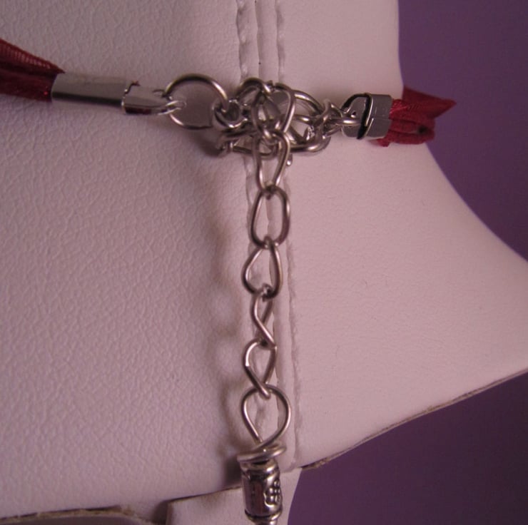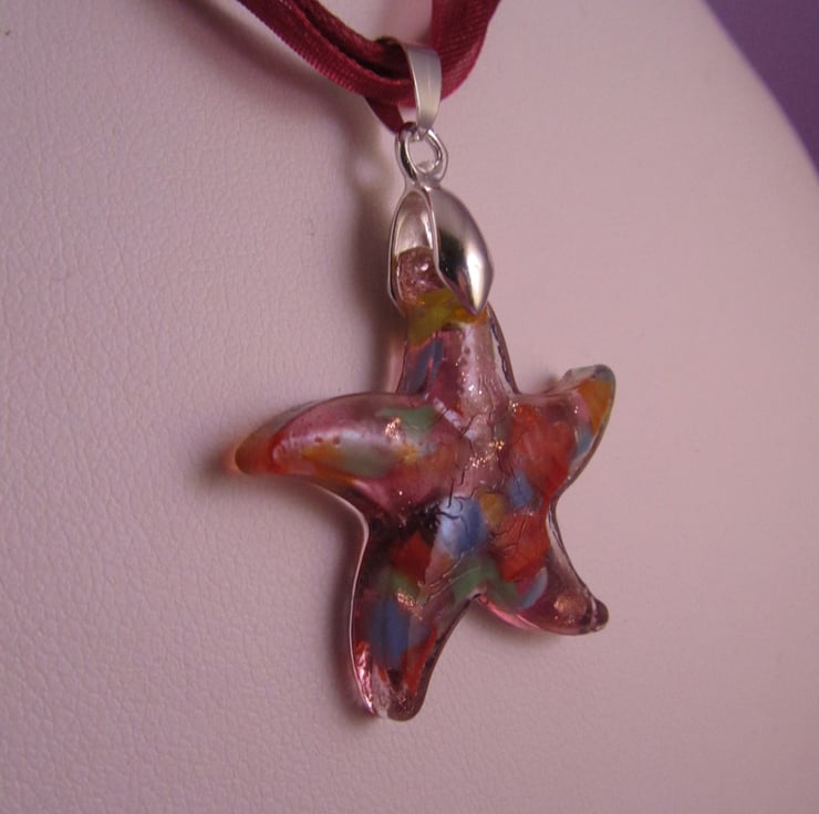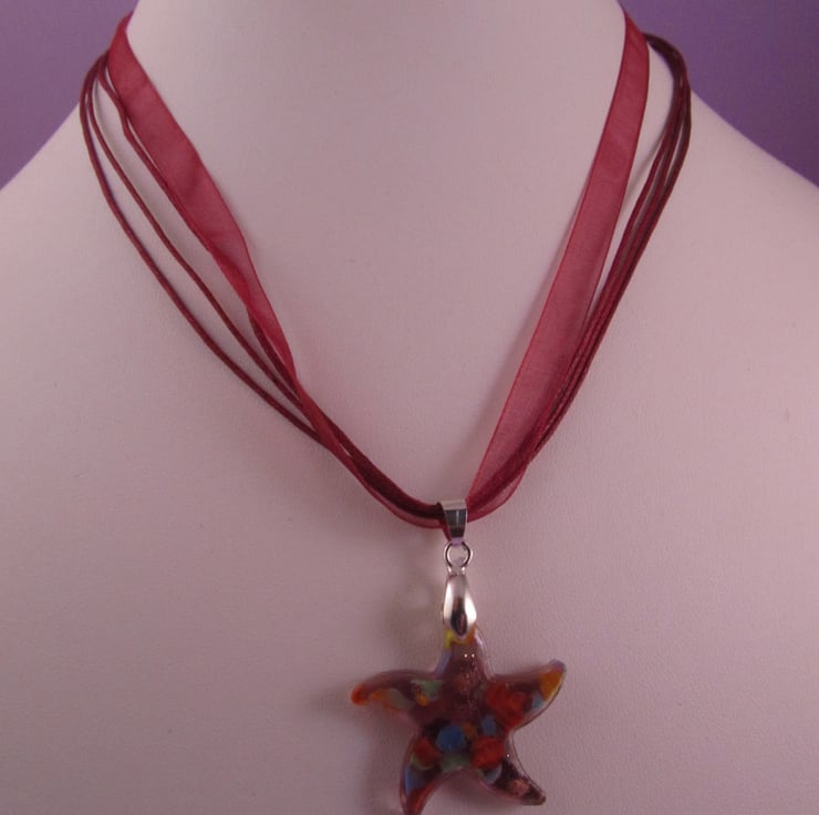 This is a gorgeous lilac glass star pendant with red necklace. It is created with a glass lilac star, silver plated brass, wax cord, organza ribbon and Tibetan Silver. It is a simple necklace for the star in your life. A great gift, or something to go with jeans.