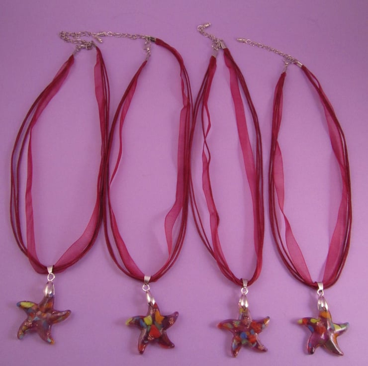 The glass star is 28 mm in diameter. There are 3 necklaces for sale at 17 and a half inches (44.5 cm) expanding to 19 inches (48.2 cm) long. There are 2 necklaces for sale at 16 and half inches (41.9 cm) expanding to 19 and a half inches (48.5 cm) long. Please choose from the options the size you would like.
