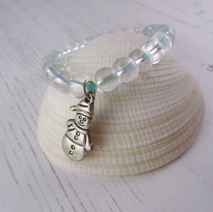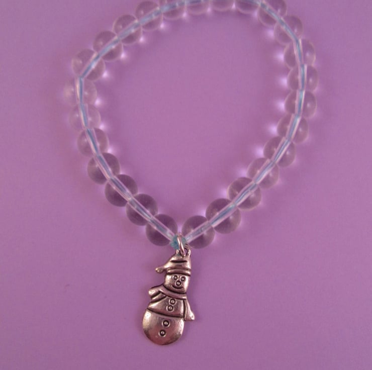 This is a cute snowman charm stretchy bracelet. It is created with a Tibetan Silver Snowman Charm, Clear Glass Beads, and Blue Elastic. A fun winter bracelet.