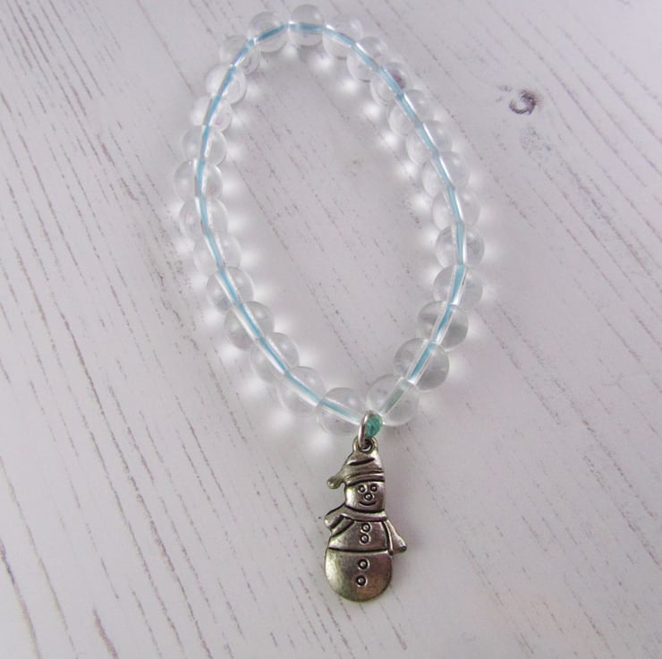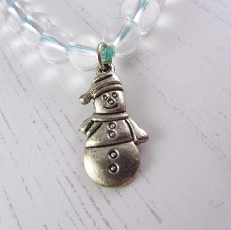 The bracelet measures 7 and a half inches (19 cm) long. The glass beads are 6 mm in diameter. The snowman charm is 2.4 cm long and 1 cm wide. A double length of the elastic was used in this bracelet for extra strength.