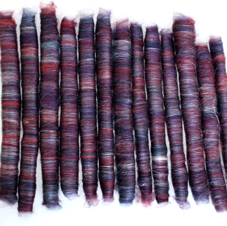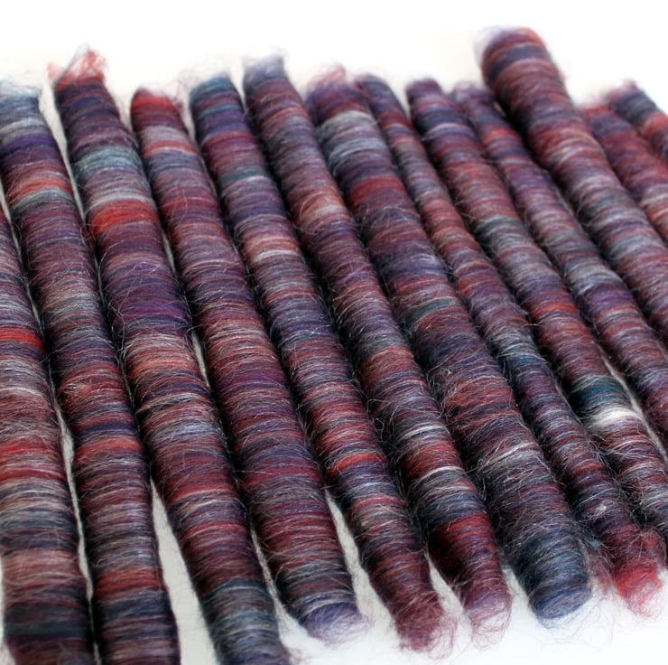 Dyed Fine Merino in my Midnight Oasis colours of reds, orange, purple and teal have been hand carded with White Silk, then slowly teased from my drum carder to create these fine punis.
