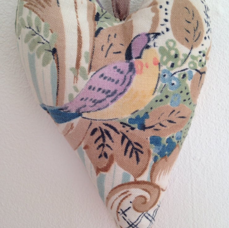 This cotton heart measures 9cm at its widest point by 14cm at its longest. It is made from vintage cotton and has a ribbon loop to hang it by. It is stuffed with polyester toy filling and a few teaspoonsful of home grown dried lavender.