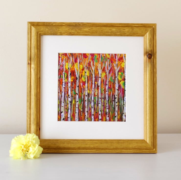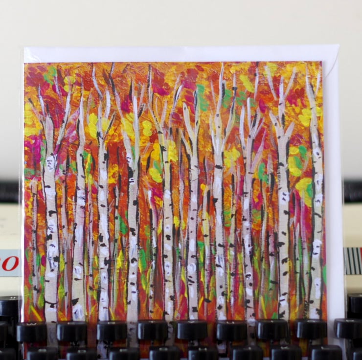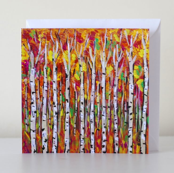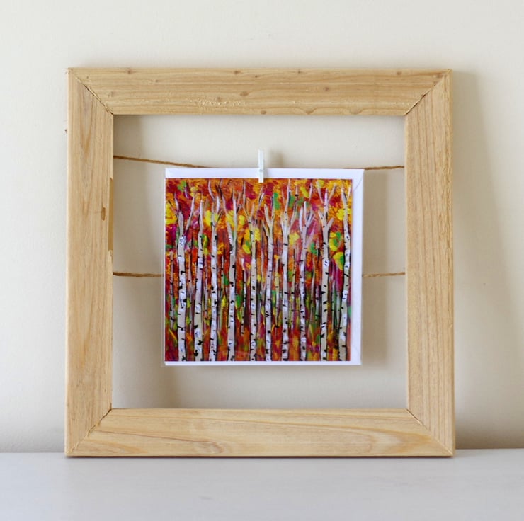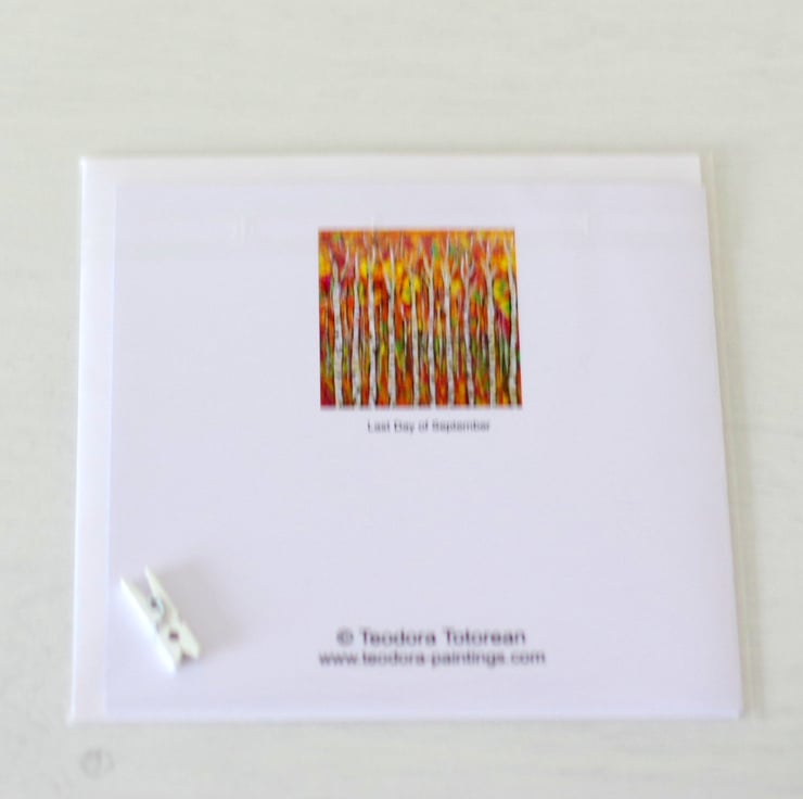 Artist card after the original painting "Last Day of September", printed at home on 230 GSM card, blank inside so you can write your own message. The card comes with a white envelope and protected in a cellophane bag. The size is approx 6" x 6" and it can be framed as a mini art print, as seen in the last photo.