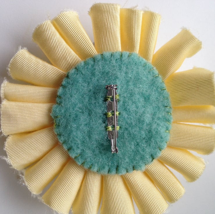 This hand-made corsage measures11cms in diameter. It is made from 3 layers of fabric and lace with a collection of beads and 2 small strings of pearl beads at its centre. The back is made from a felt circle and has a brooch back with a safety closure sewn on to it.