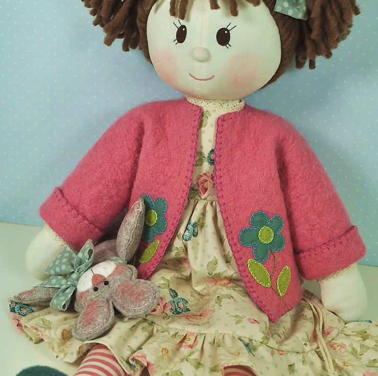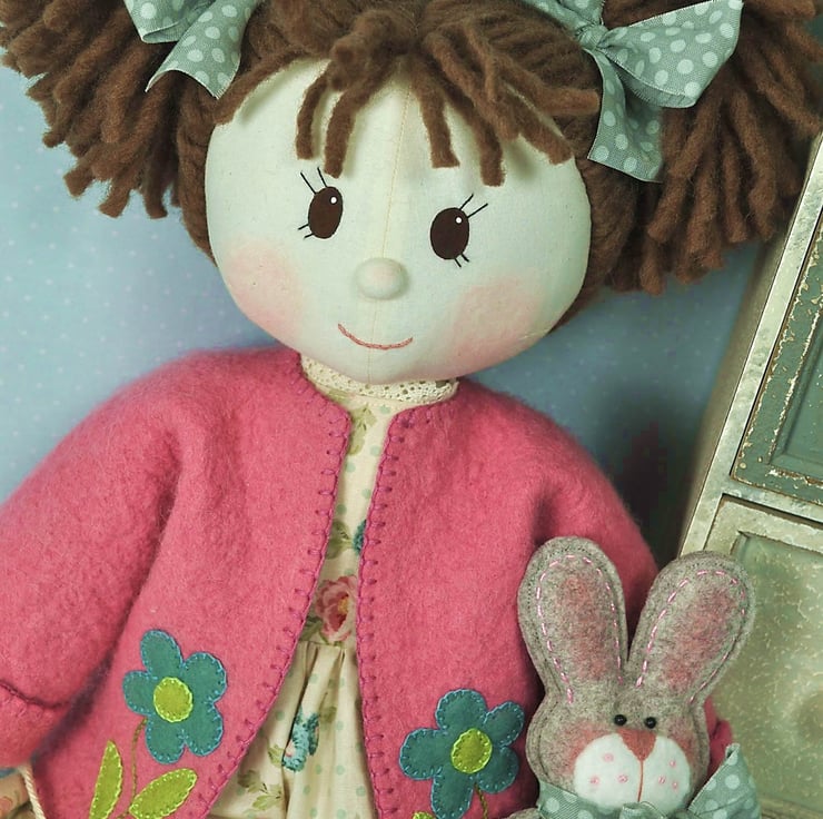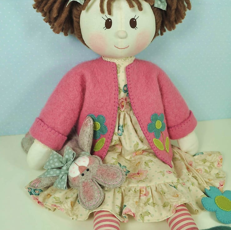This pattern contains comprehensive step by step instructions with diagrams suitable for a beginner as well as a more accomplished sewer. The pattern shows you how to make a rag doll, her dress, cardigan, drawers, rabbit and flower tag. Full sized pattern sheets printed on A3 paper, so no enlarging necessary. All her clothes are designed to be removable.