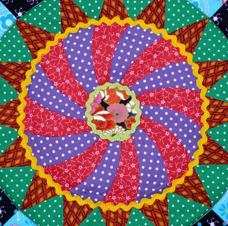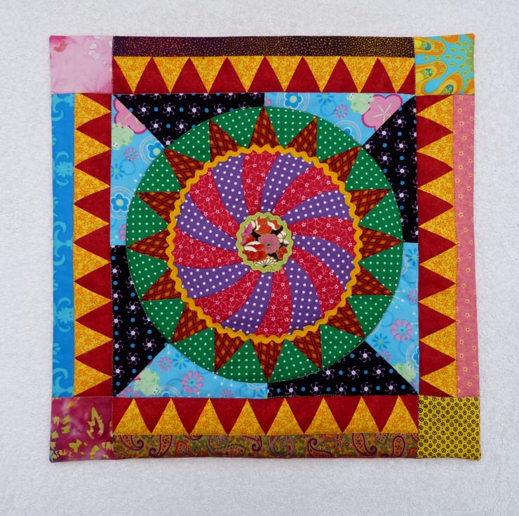 This fantastic patchwork cushion cover has been made using foundation piecing techniques over papers. Cotton fabrics have been used, and embellished with ric-rac. The cover has been quilted.