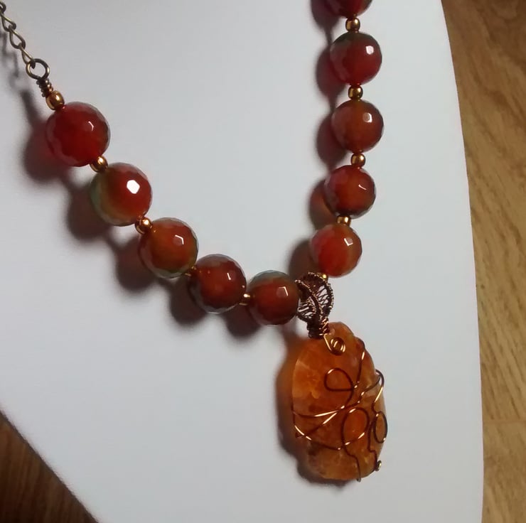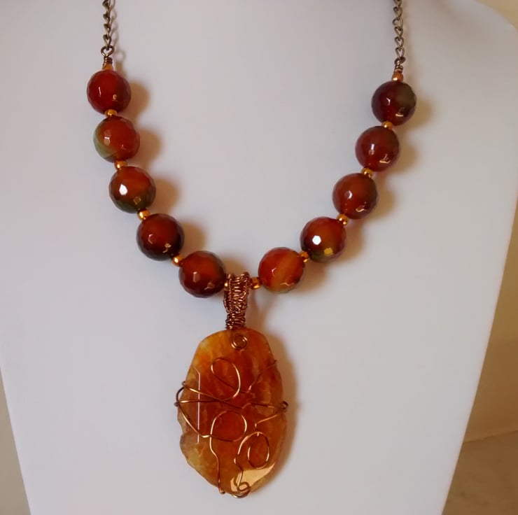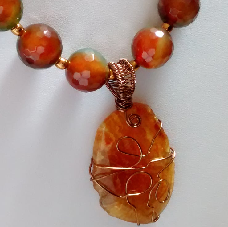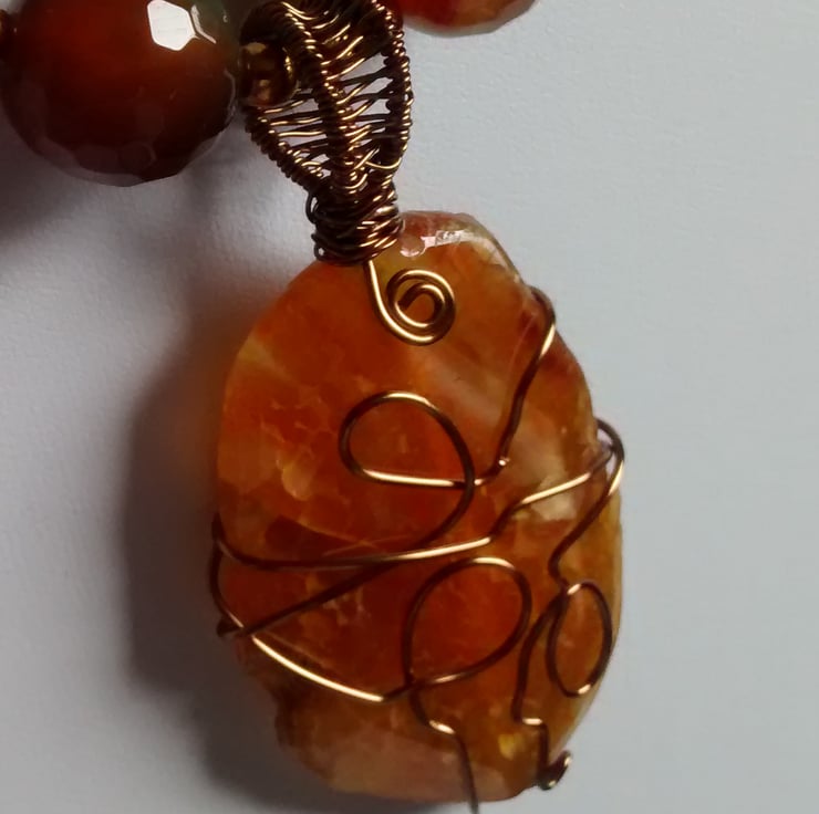 A nice statement necklace of multi coloured Agate Faceted Rounds and an Organic Antique Wire Wrapped Hand Faceted Orange Crackled Slab