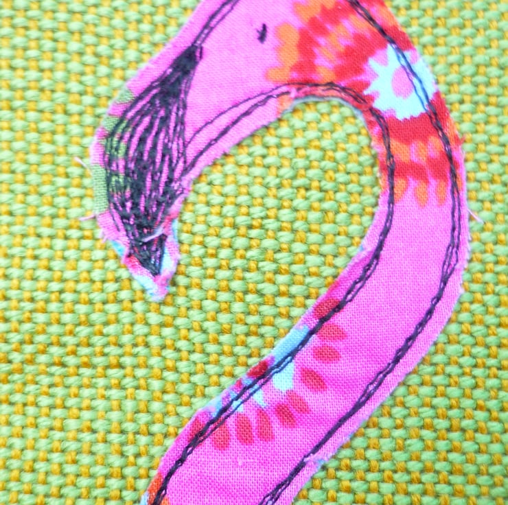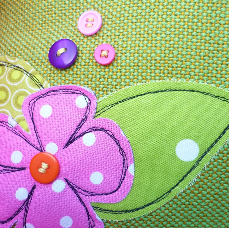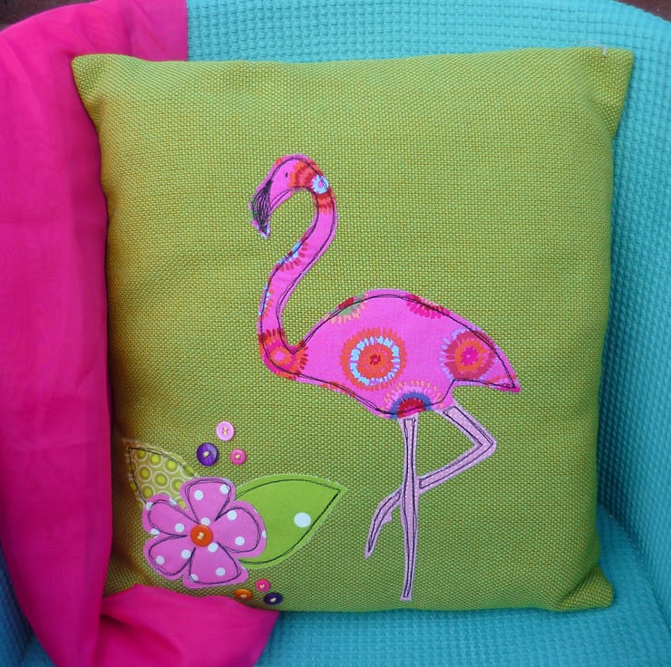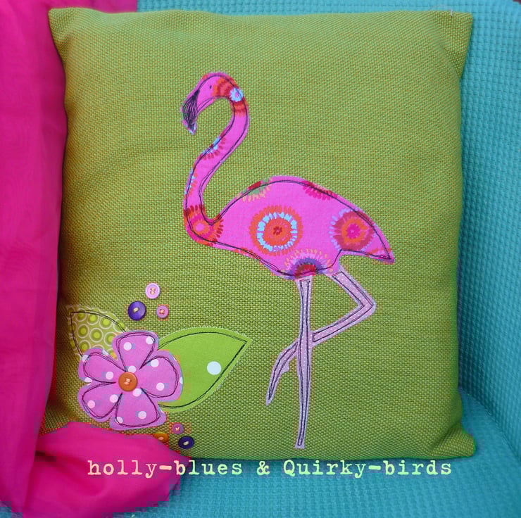 I have handmade this cushion from wonderful bright lime green heavy wool blend fabric. I have appliqued a flamingo and flower design which i have free motion machine embroidered into place, i have then embellished it with button accents. As each of my cushions is handmade, each one will be slightly different, you can be sure your item is unique.
