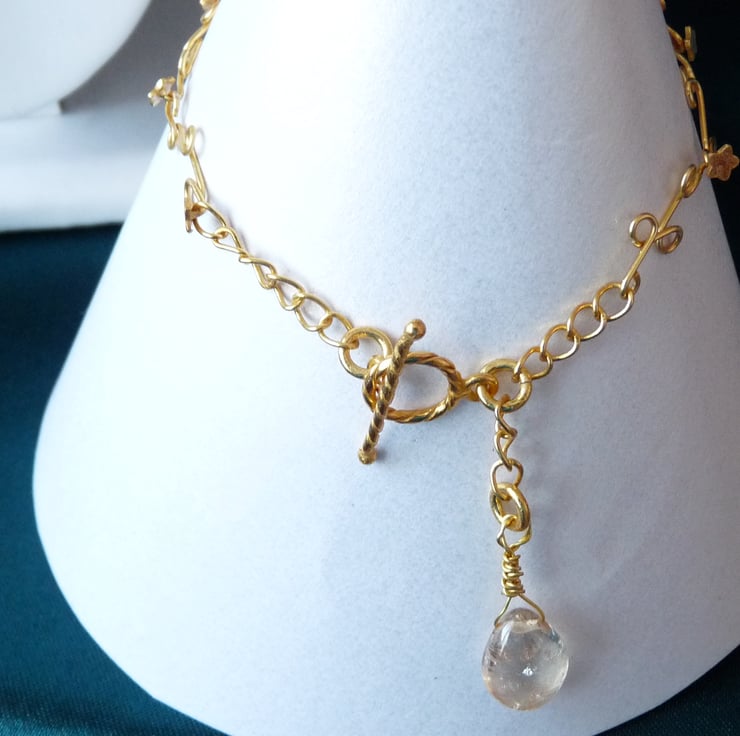 This bracelet has been made with a single champagne quartz pear shaped drop approx. 11mm in length. Connected to a chain link dangle and then attached onto gold plated copper star headpin chain. Approx 7" / 17.5cm in length & finished with a round toggle clasp.