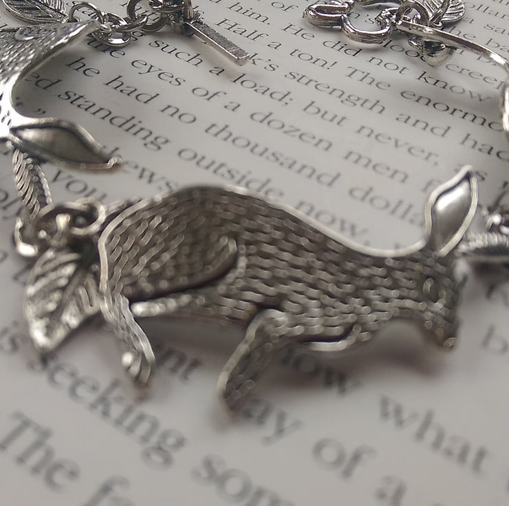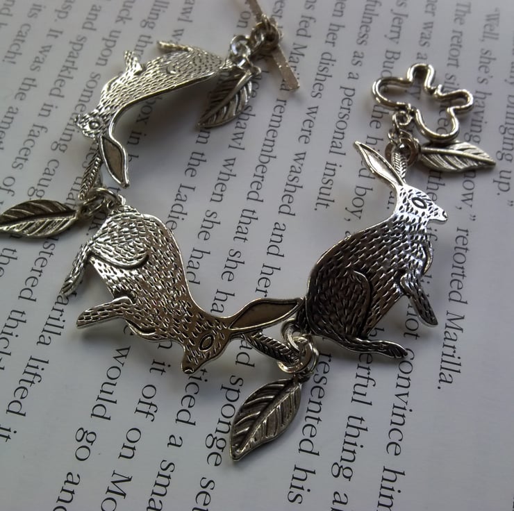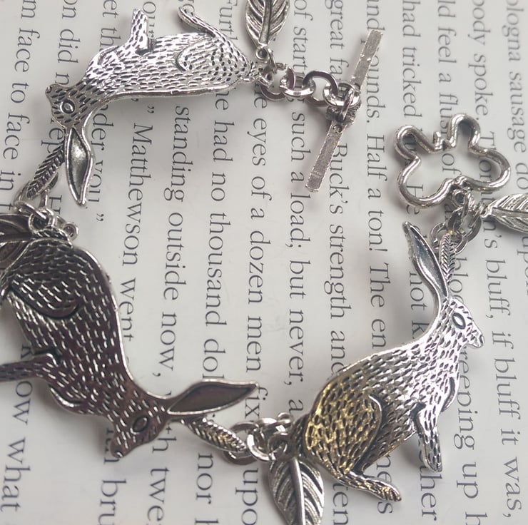 This lovely Hare bracelet has 3 rabbit s holding each other's tails the bracelet measures 7.5 inches which can be adjusted to suit it has a beautiful butterfly toggle fastener.