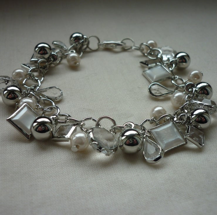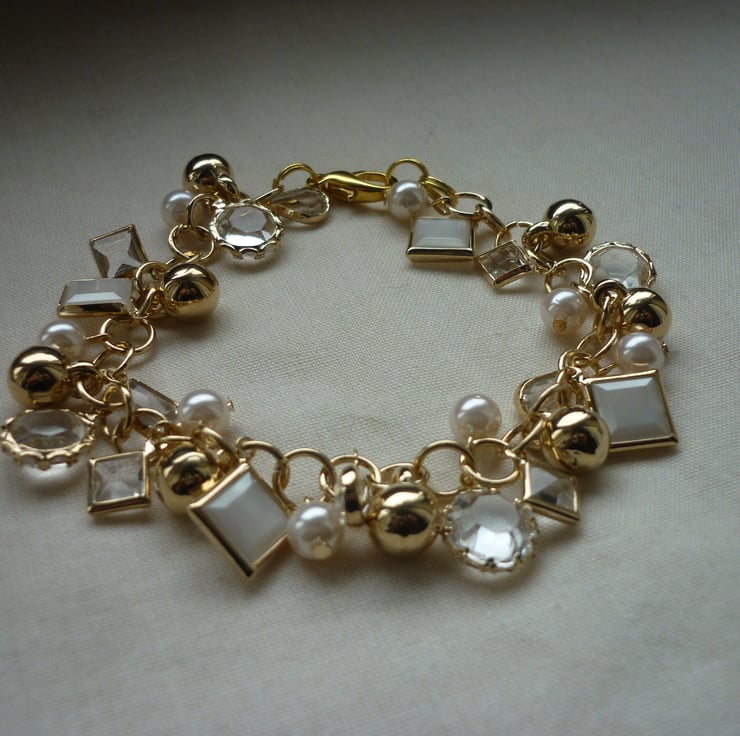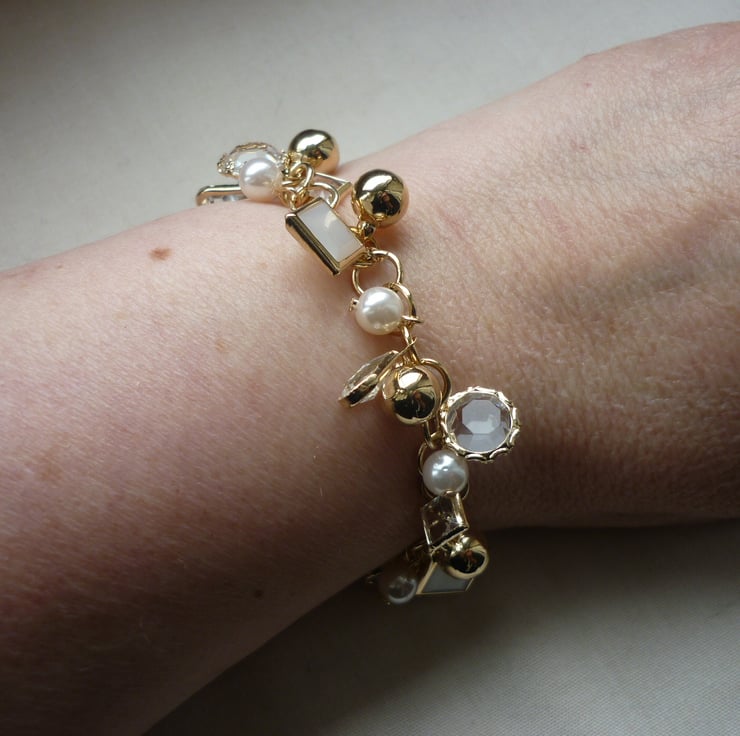 THIS ATTRACTIVE BRACELET HAS BEEN MADE USING LIGHT WEIGHT GOLD PLATED CHAIN ALONG WITH GOLD PLATED ACRYLIC CHARMS IN CRYSTAL AND PEARLS AND FINISHED WITH GOLD PLATED LOBSTER CLASP AND FINDINGS.