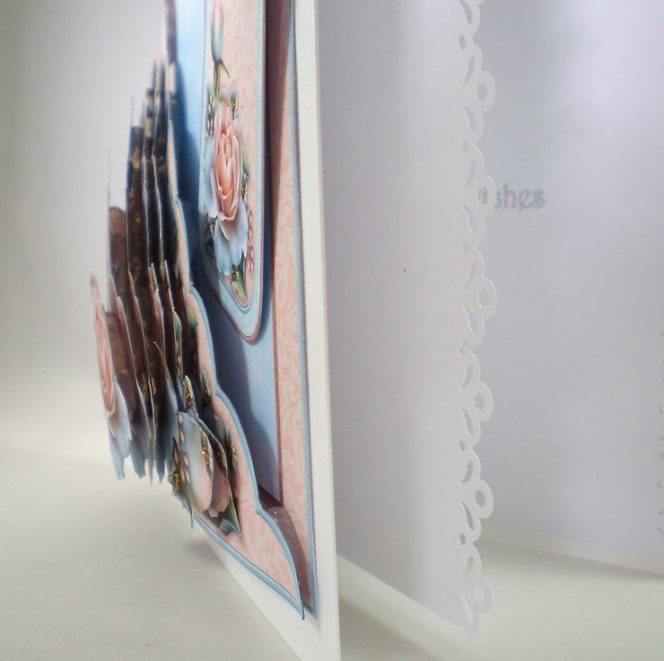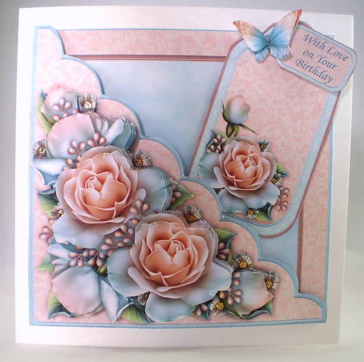 A decoupage/3D effect white card measuring 145x145mm (5.75x5.75in) features a 3D design of roses.