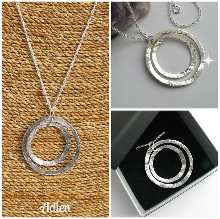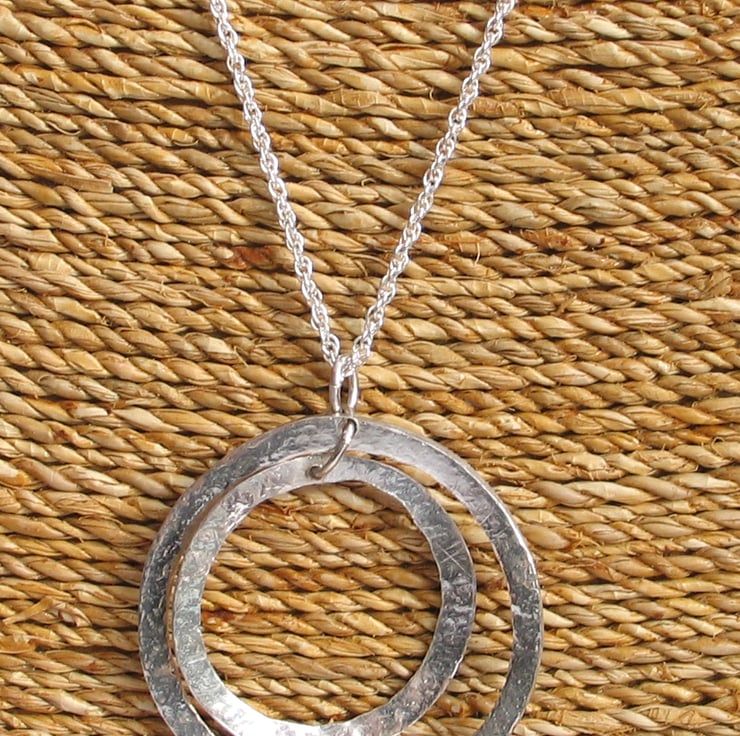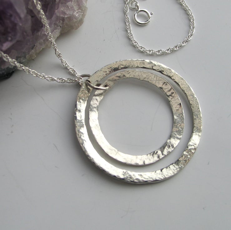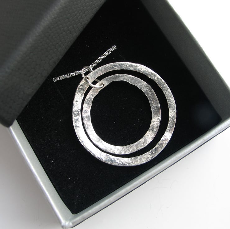 A contemporary design necklace featuring 2 concentric circles. Both in a beautiful silver hammered finish.