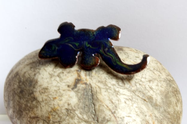 This lizard is made in blue enamel over clear enamel with a scrolled pattern in yellow from its head down its backbone to the tip of its tail.