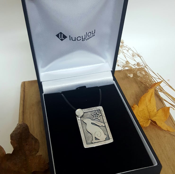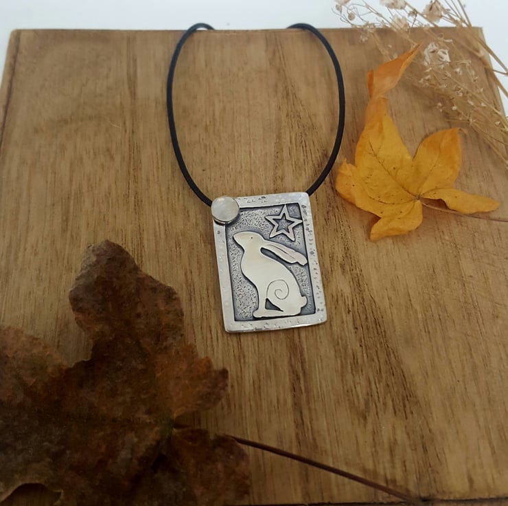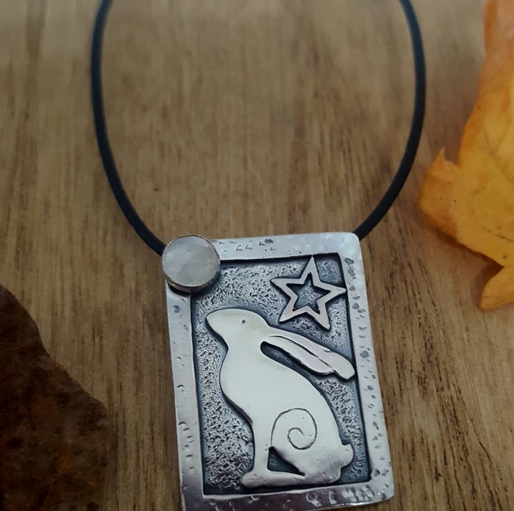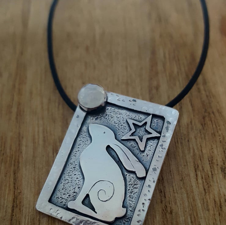 Measuring 32mm by 22 mm this pendant is made from 925 sterling silver, featuring a whimsical hare and star, and a moonstone with hand engraved decoration and textured detail added using hammers and punches.