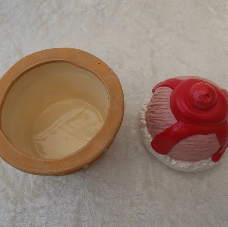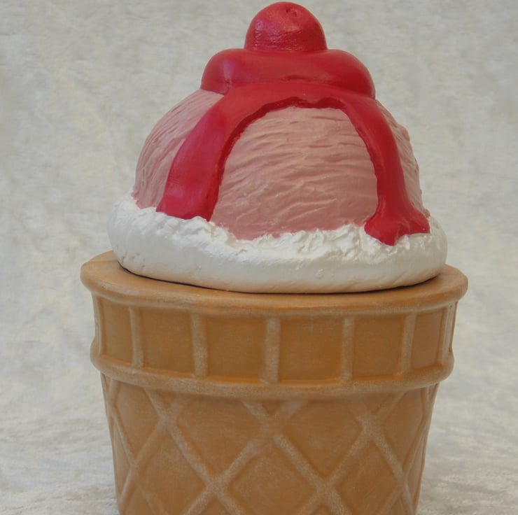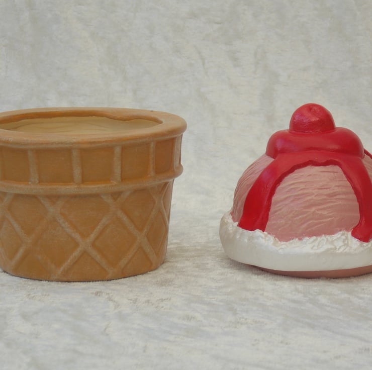 I have for sale a jewellery/trinket box, which was hand painted by myself. It is a pink strawberry ice-cream sundae, sat on top of an ice-cream cone. The sundae part is the lid and the ice-cream cone part would hold your items. This would make a fun and novel addition to anyone's home, or perhaps given as a gift.