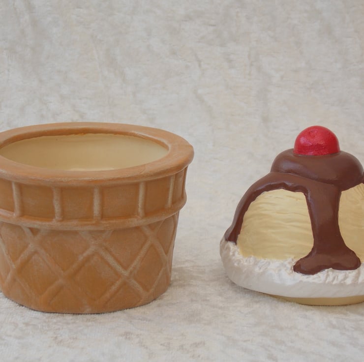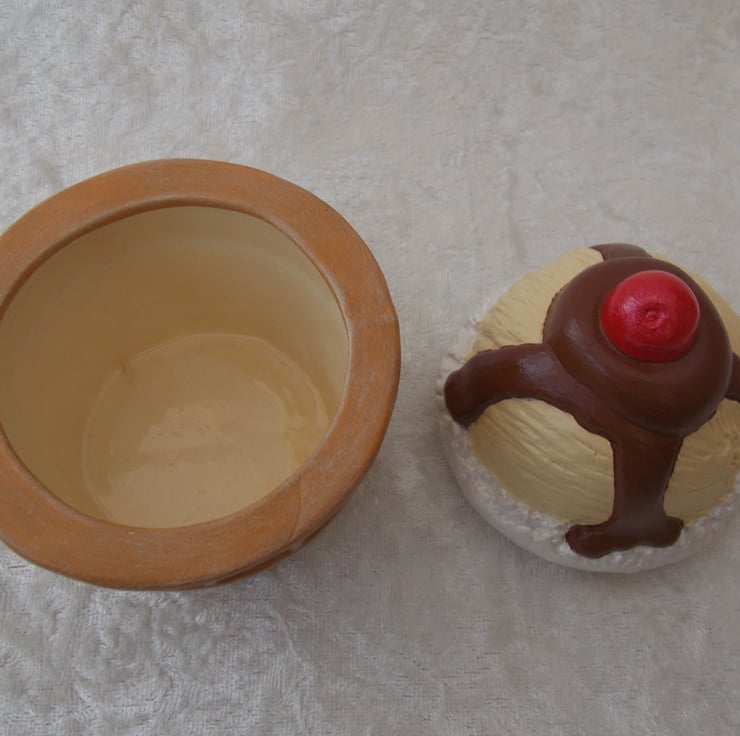 I have for sale a ceramic jewellery/trinket box, which was hand painted by myself. It is a vanilla ice-cream sundae, covered in chocolate sauce, cream around the outside and a cherry on the top. This is the lid of the trinket box, the ice-cream cone holds any items. This would make a fun and novel addition to anyone's home, or perhaps given as a gift.