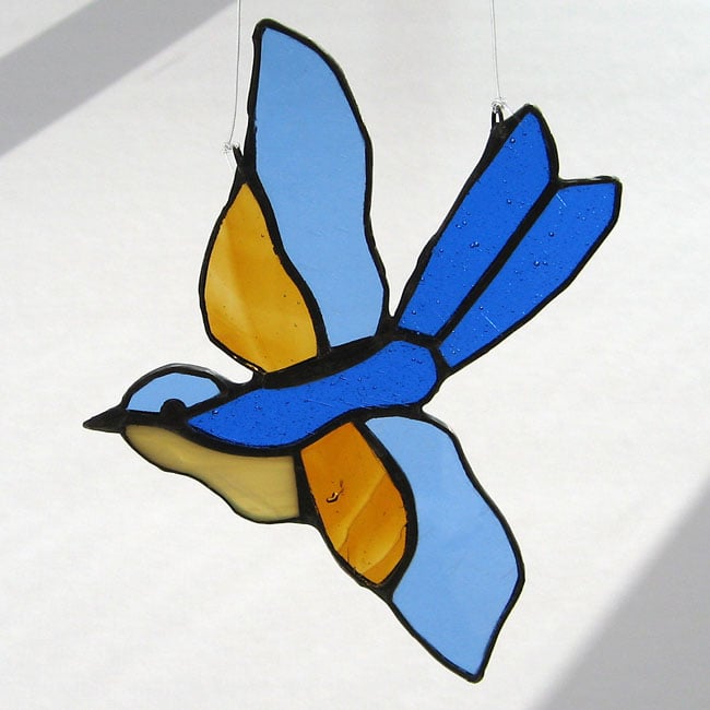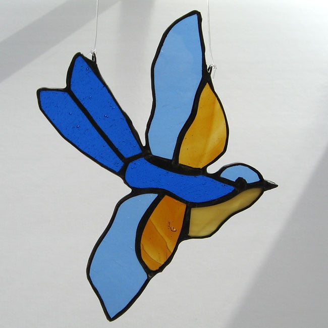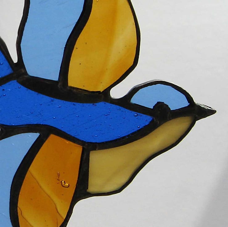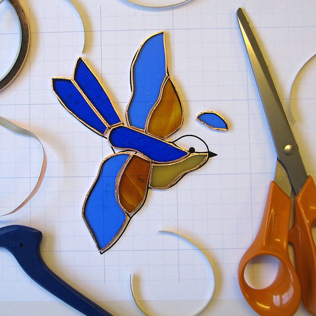 This little bird has been made using the copper foil technique. Each piece of glass is cut, ground, edged in copper foil, soldered together and finished with a bronze patina.