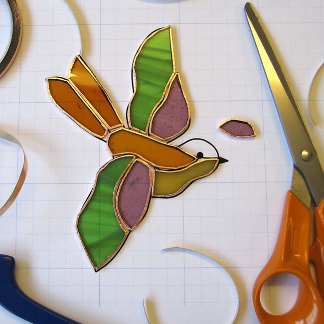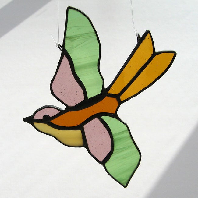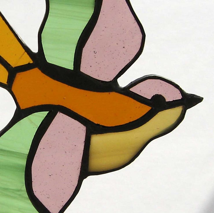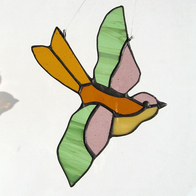 This little bird suncatcher has been made to my original design using the copper foil technique. Each piece of glass is cut, edged in copper foil and then soldered together.