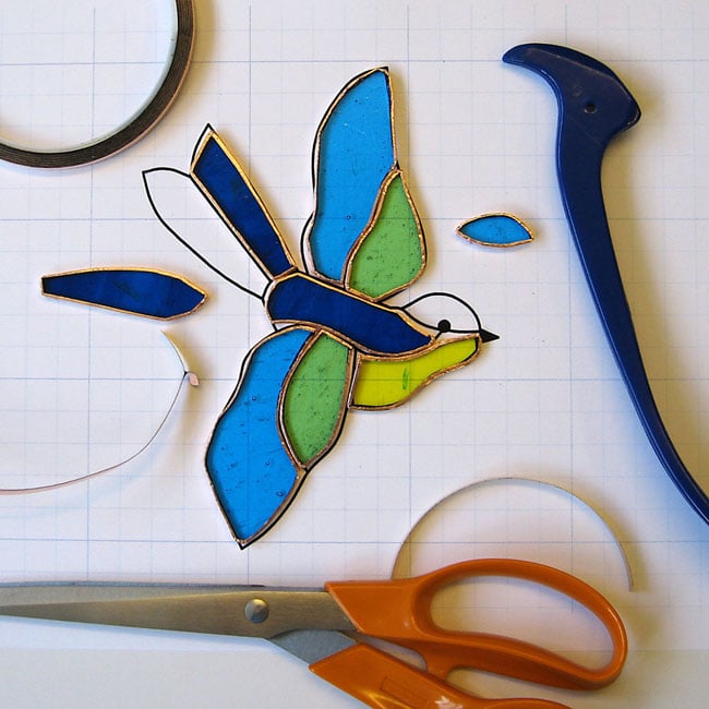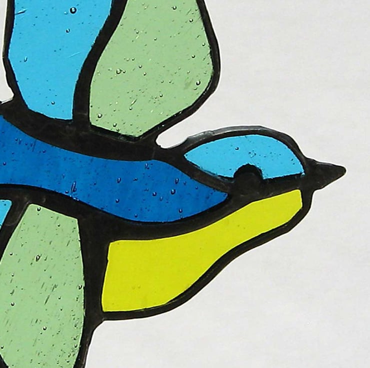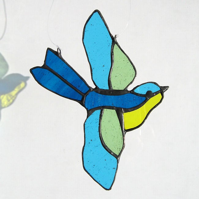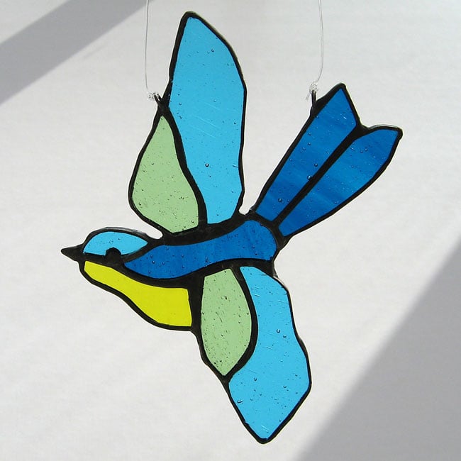 This little bird suncatcher has been made to my original design using the copper foil technique. Each piece of glass is cut, edged in copper foil and then soldered together.