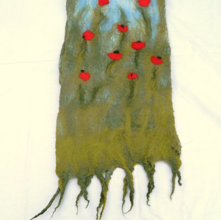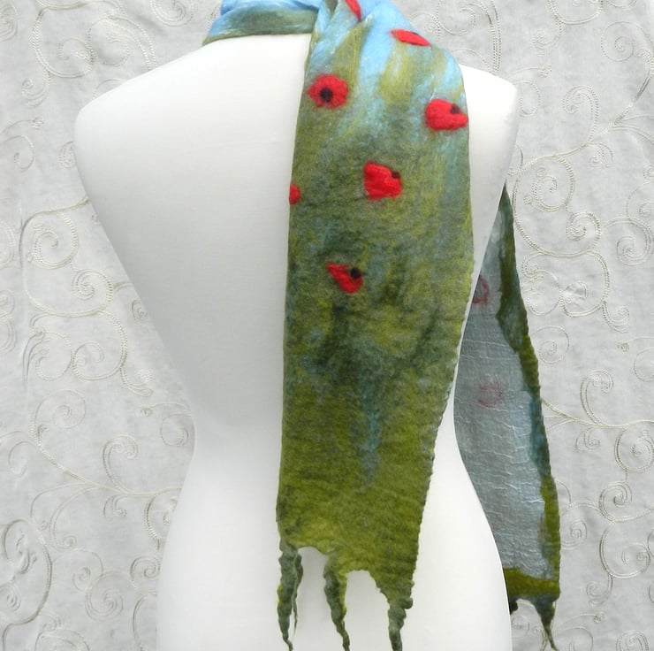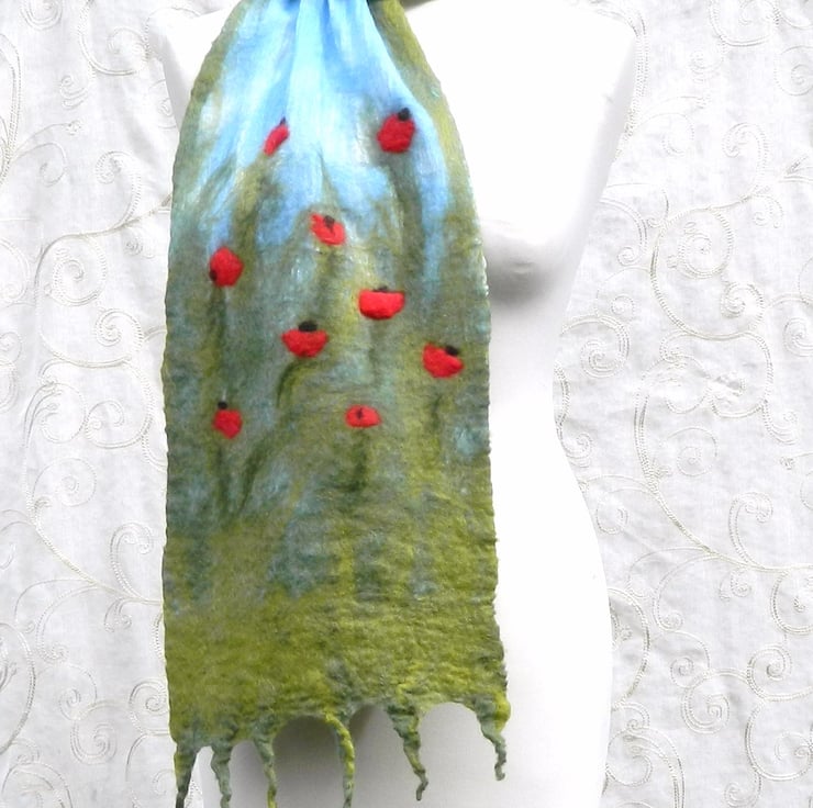 Red Green Poppy Scarf Shawl Wrap Gifts for Women Silk and Wool Felted Nuno Nature Handmade Felt Women's Gift