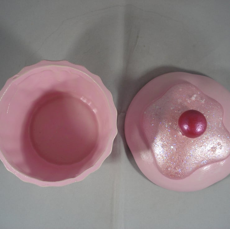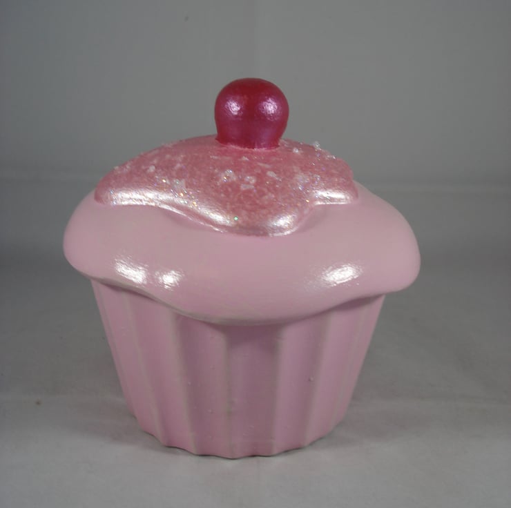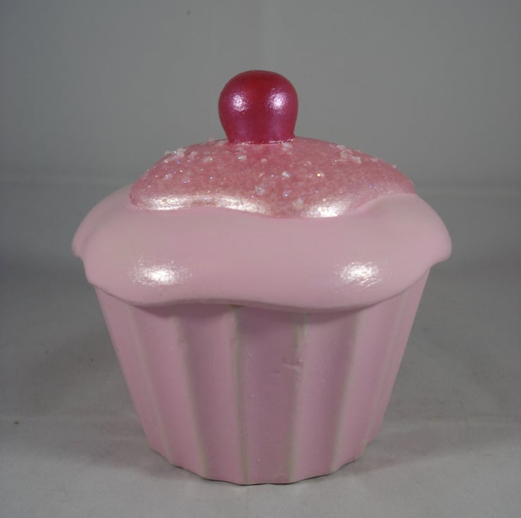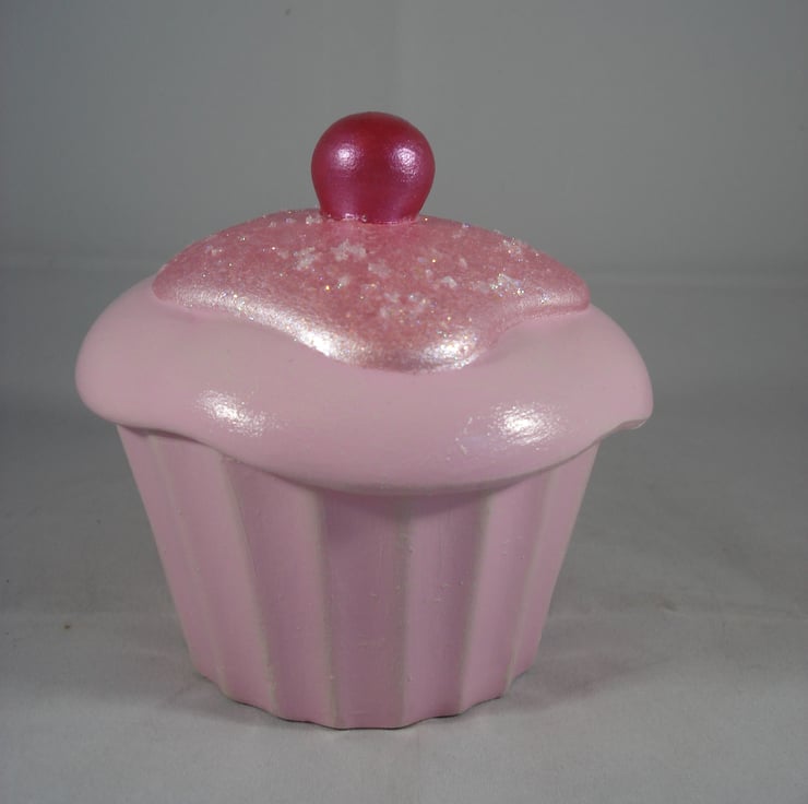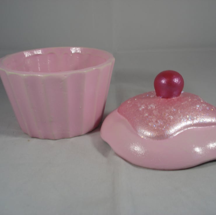 I have for sale a ceramic jewellery/trinket box, which was hand painted by myself. It is a pretty pink cupcake, with part of the top covered in a glittery pearl pink icing with a raspberry coloured cherry on top. The top part of the trinket box is the lid, the main cake part would hold your items. This would make a lovely addition to anyone's home, or perhaps given as a gift.