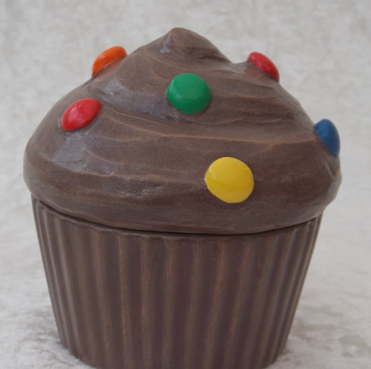 I have for sale a ceramic jewellery/trinket box, which was hand painted by myself. It is a chocolate muffin or cupcake, dotted all over the top half are assorted colours of sweets or smarties. This part of the trinket box is the lid, the bottom part would hold your items. This would make a fun and novel addition to anyone's home, or perhaps given as a gift.