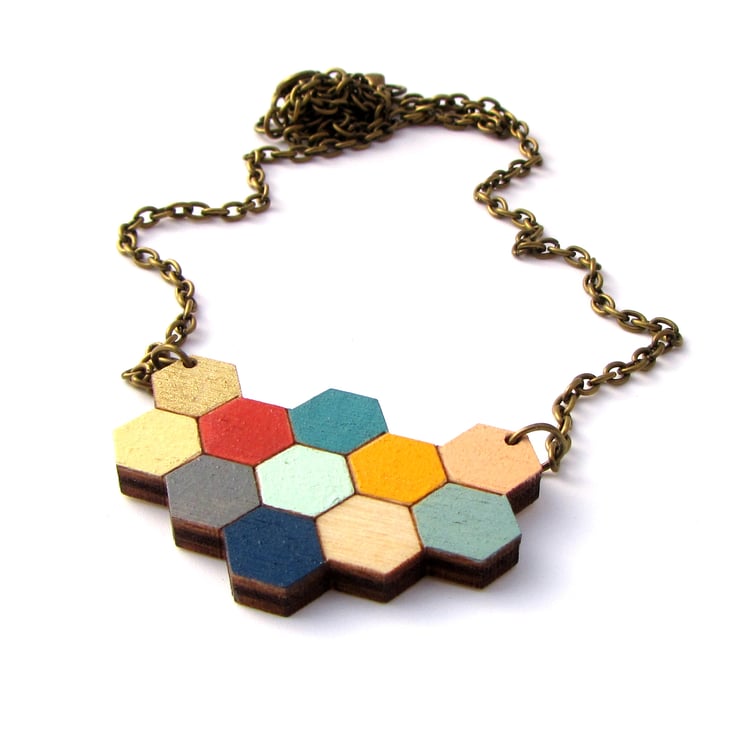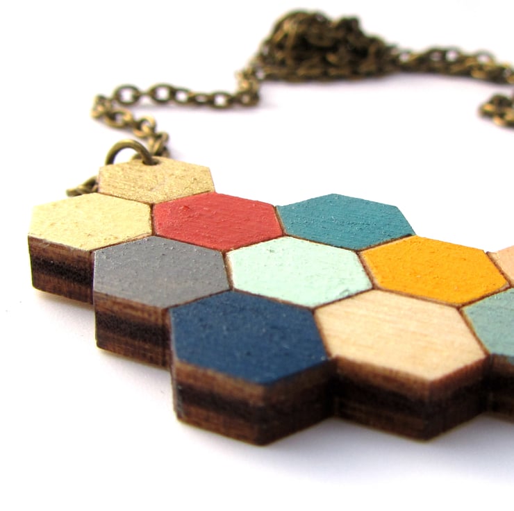 A hand painted contemporary necklace made from laser cut birch plywood.