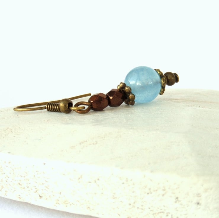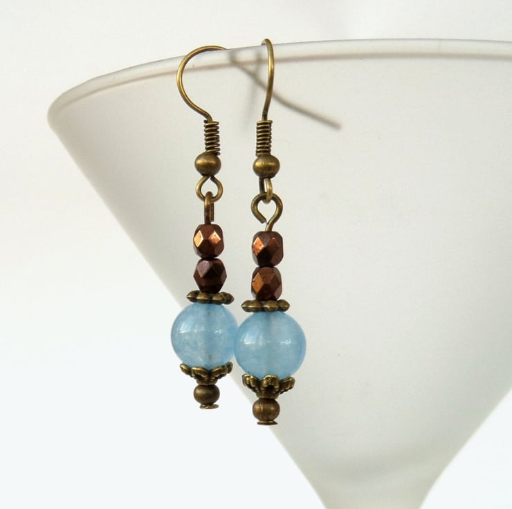 A pretty pair of handmade earrings, with a lovely shade of blue jade combined with rich brown crystals on bronze wires.