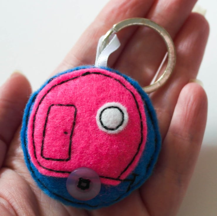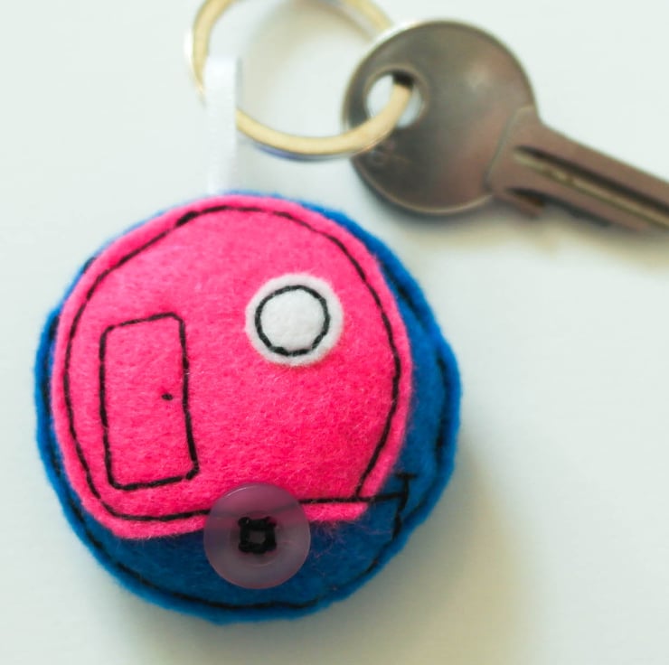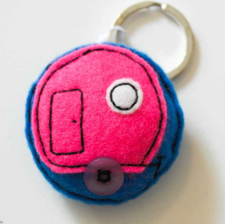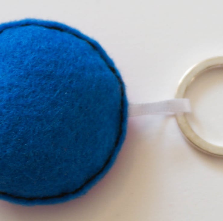 Hand cut, hand sewn using felt and with cotton thread On the top is attached a stainless steel keyring, using a sewn in piece of white ribbon. The keyring inside is lightly stuffed. The wheel is a small pale purple button.